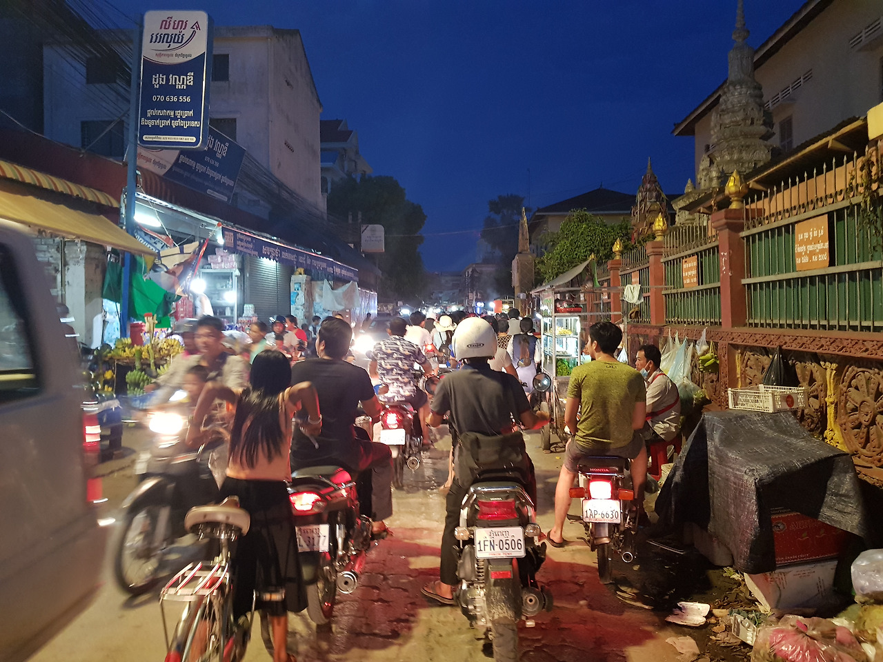 나는 다시 뛰기 시작했다. 어둠이 깔리기 시작하니 빨리 뛰어야 했다. 킬링필드 가는 외길을 벗어나 큰 도로 지나 다시 쓰레기와 악취가 진동하던 흙길을 달려 골목길에 접어들었다. 이제 2.5km 정도 더 가면 된다. 그런데 올 땐 한적했던 그 길이 저녁 시간이라 그런지 시장 골목이 북새통이다. 걸을 수 없을 정도다. 나는 이리저리 달려 시장통 골목길을 나왔다.