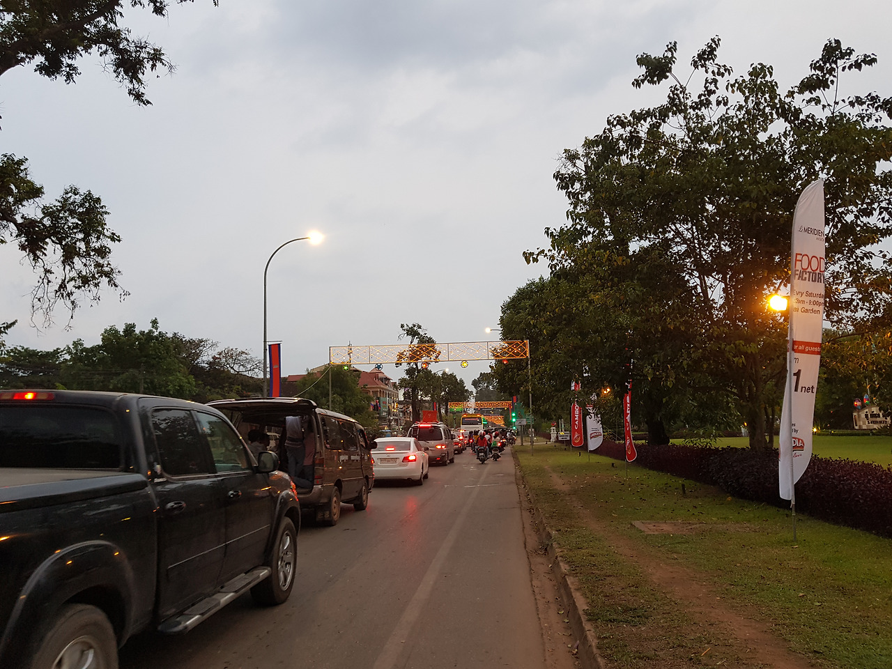 앙코르왓을 두고오는 아쉬움도 있지만 꿈에 그리던 앙코르왓을 두발로 뛰었다는 감동이 더 컸다. 나는 피곤함도 잊고 다시 호텔을 향해 뛰기 시작했다. 계속해서 밀려드는 차들로 갓길 뛰기가 좋지 않아 뛰다 걷다를 반복하며 3km 정도를 지나니 도로가 한적해진다. 서서히 어둠이 밀려오고 피로감도 같이 밀려왔다. 5km 정도 지나니 씨엠립 시내가 나오고 어둠이 깔리기 시작한다. 가로등 불빛, 네온이 이곳이 앙코르왓의 씨엠립이라고 말하고 있다.