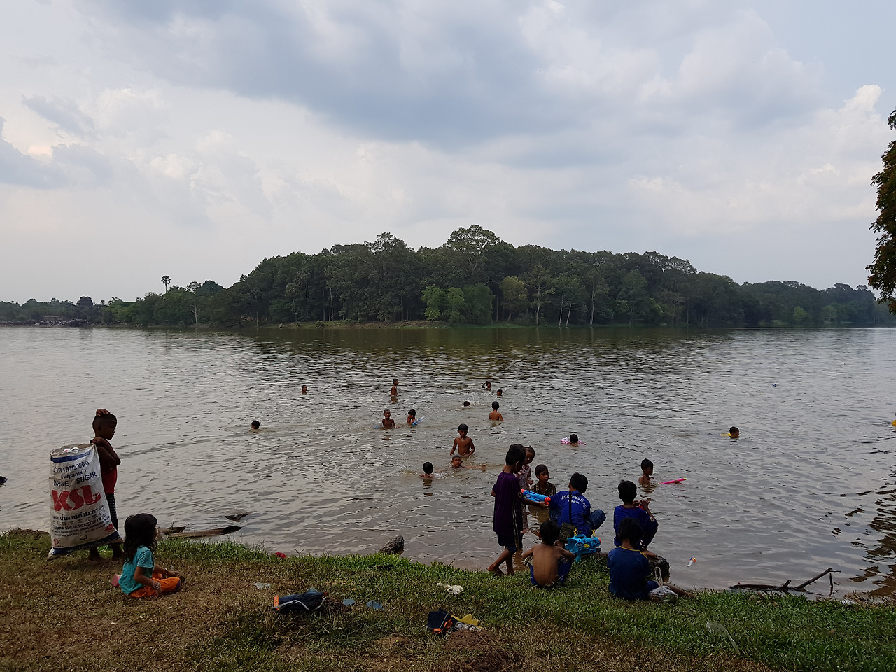 앙코르왓 서쪽 정문 쪽으로 가는 길은 차들과 해자를 강으로 삼아 놀이 나온 사람들로 북적여 뛰는 길조차 없다. 나는 조심스럽게 사람과 차를 피하며 달렸다. 해자 물가에서 노는 아이들의 모습이 천진난만하다.