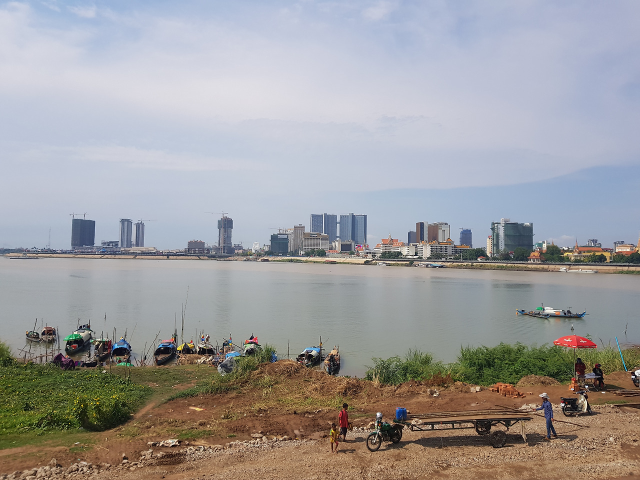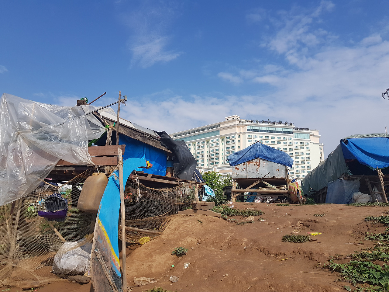 이곳에 메콩강변을 보며 따라 달리는 길은 없었다. 나는 메콩강과 돈레삽강의 합류 지점(왕궁 앞에서 바라본 맞은편)을 향해 메콩강 안쪽으로 난 도로를 달렸다. 내가 달리던 도로에서 합류지점은 먼데서 봐도 금방 알 수 있다. 캄보디아에서 가장 좋은 호텔인 쏘카 호텔이 멀리서도 보이기 때문이다. 왕궁 앞에서 건너편 바로 보이는 호텔이 최고급 호텔, 쏘카 호텔이다. 쏘카 호텔을 끼고 옆으로 달리던 나는 두 강의 합류지점에서 발걸음을 멈췄다. 드넓은 두 강의 합류를 마주 보는 설렘도 있었지만 합류지점 메콩강 끝자락의 강가 마을이 눈에 들어왔기 때문이다. 멀리서 봐도 한눈에 알 수 있는 판잣집. 덕지덕지 이어 붙인 나무토막 집들은 나의 상상을 초월했다. 나의 발걸음은 어느덧 그곳으로 향하고 있었다. 캄보디아 최고급 호텔 아래 메콩강가에서 하루하루를 살아가는 이곳은 캄보디아 왕궁으로부터 바로 강을 건너 온다면 3km도 안 되는 거리에 있다.