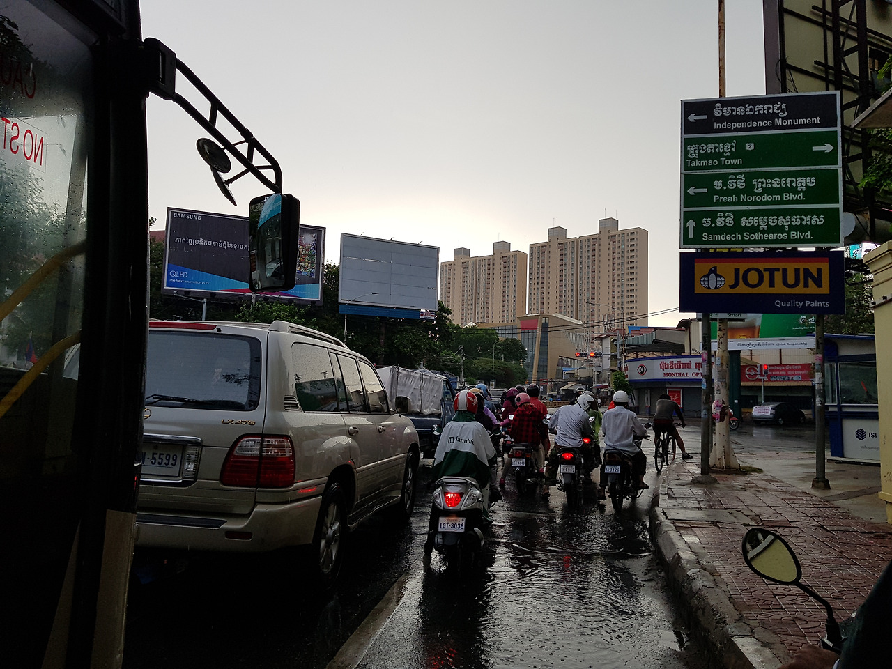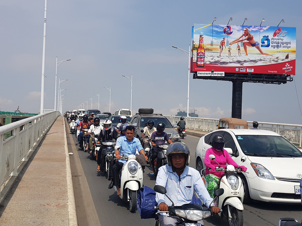 쉬지 않고 달려와 다리에 왔다. 어느덧 비가 걷히고 해가 쨍쨍하다. 이젠 더위와의 싸움이다. 이 다리는 일본이 무상으로 지어준 다리인데 2차선으로 폭이 좁아 지금 다시 일본의 원조로 옆에 다리를 하나 더 건설 중에 있다. 원조를 디딤돌로 삼아 옛 크메르 제국의 영화를 재건하는 걸 기대하는 건 무리일까? 다리를 지나는 무수히 많은 사람들에게서 그 희망을 보는 듯 하다.