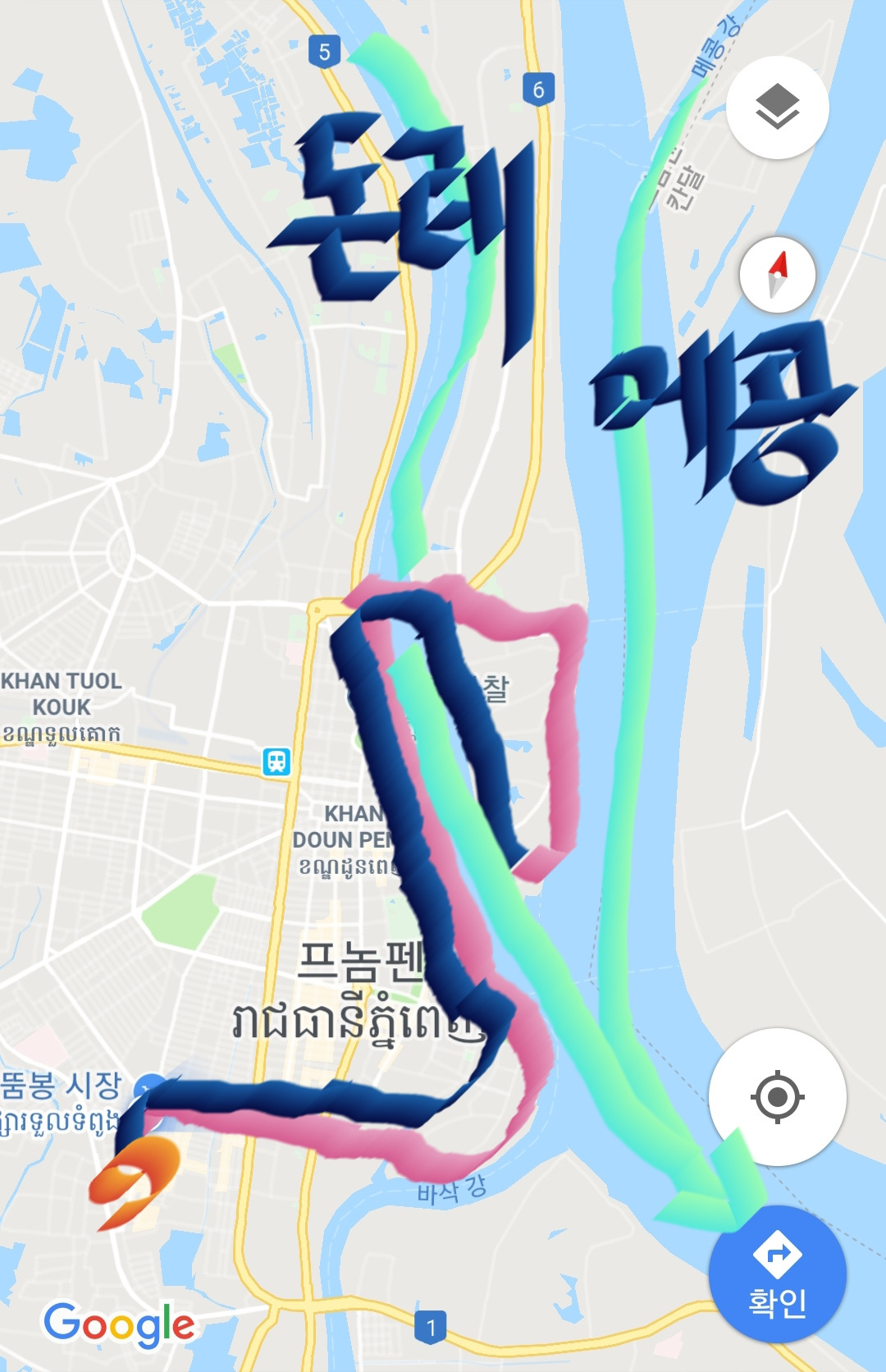 5월 3일은 캄보디아의 휴일이다. Royal Plowing Ceremony(왕실 농경의 날). 캄보디아의 한낮이 35도를 넘나 들기에 아침 일찍 뛰기로 하고 전날 준비를 마친 나는 아침 6시에 일어났다. 세차게 뿌리던 비는 잦아들었고 이런 날씨는 햇빛이 없으니 뛰기 더 좋다고 위안하며 아침을 간단히 먹었다. 준비물로는 얼린 물 2개와 전날 길거리에서 사 온 쌀로 만든 호떡 같은 거(?). 오늘 나는 왕궁이 있는 강가까지 6km를 멀리 돌아 뛰어 간뒤 그 뒤부터는 돈레삽강을 따라 달리다 돈레삽강을 건너 메콩강가를 달릴 생각이다. 숙소에서 대략 왕복 30km 거리. 그래서 되도록이면 이른 아침에 출발하여 11시 전에는 달리기를 마치는 계획을 세웠다. 왕궁까지는 몇 번 뛰어갔던 적도 있고 프놈펜 생활 두 달이기에 구글 지도를 보면 어느 정도는 알 수 있다. 코스에 대한 불안감은 없다.