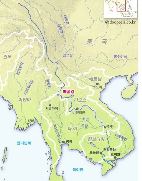 메콩강. 길이 4,020km, 유역면적은 80만 km. 동남아시아 최대의 강이며 세계적으로도 손꼽히는 큰 강이다. 중국 靑海省 티베트 지방의 여러 강이 昌都부근에서 합류하여 雲南省을 남류하여 라오스와의 국경에 도달하여 라오스에서 1,500km에 걸쳐 흐르다가 캄보디아의 국경에서 폭포를 이룬다. 그 뒤 캄보디아를 남류하다가 크라티에에 이르는데, 이 부근부터 프놈펜까지는 상당히 큰 선박의 항행도 가능하며 지류들이 합쳐져 수량은 더욱 풍부해지고 흐름도 완만해진다. 프놈펜 중심지에서 돈레삽강(江)과 합류했다가 프놈펜 남쪽에 이르러 두 강으로 갈라지는데, 동쪽으로는 본래의 메콩강이 흐르고, 서쪽으로는 분류인 바삭강(江)이 흐른다. 여기서부터 베트남으로 들어가 220km를 흐르는데 흐름은 매우 완만하고 폭이 2km나 되며 유역에는 메콩강 삼각주 지대가 펼쳐진다. 베트남의 메콩강은 다이강(江)을 비롯한 9개의 강으로 갈라지는데, 이 때문에 베트남에서는 메콩강을 구룡강(九龍江)이라고도 부른다.