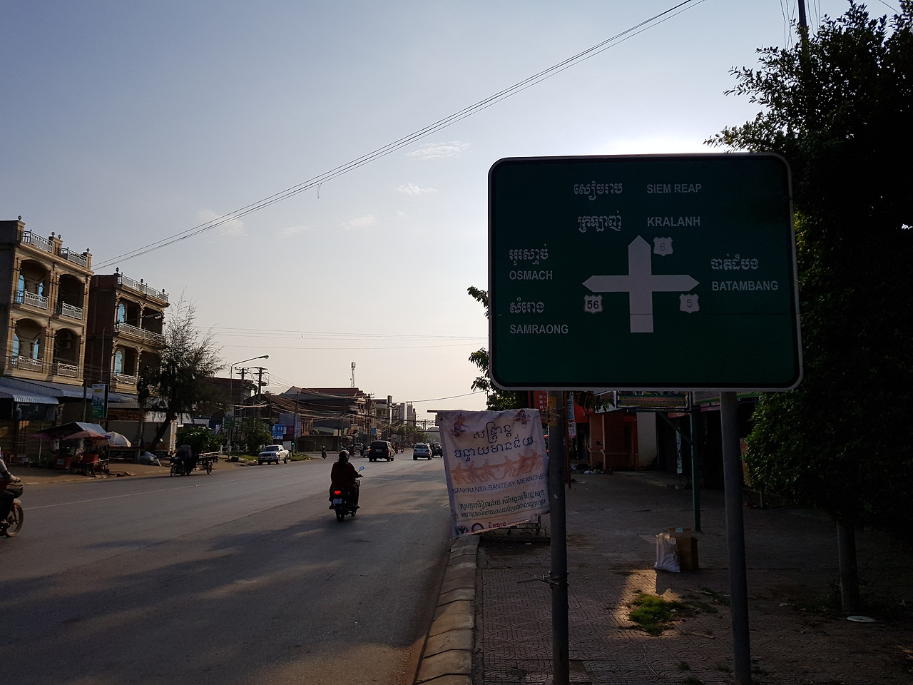 아침 6시의 날씨지만 태양은 서서히 달궈지고 있고 대로변에 진입한 나는 등줄기에 금세 땀이 흐른다. 반티민쩨이 중심가는 프놈펜-시엠립(앙코르왓의 도시)-반티민쩨이-포이펫(태국 국경도시)으로 가는 6번 국도가 자리 잡고 있다. 아침을 시작하는 차들과 사람들이 보인다