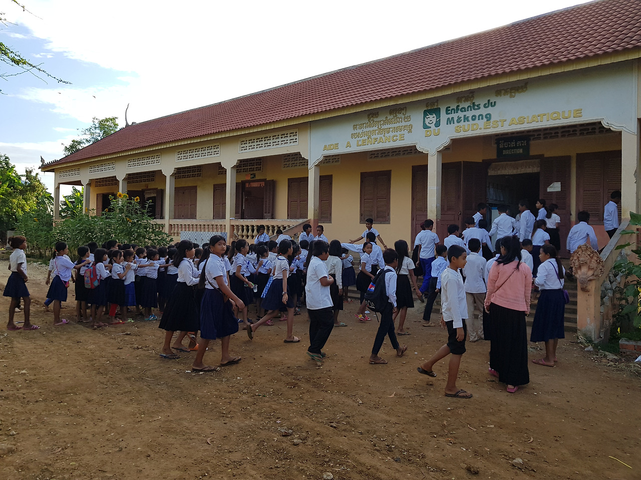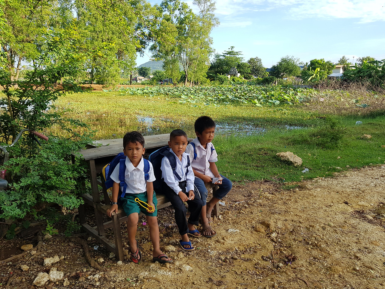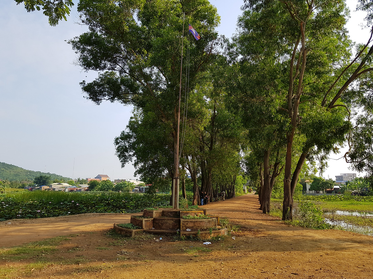 돌아오는 발걸음이 무겁다. 나의 어린 시절은 추억이 되었지만 여기는 현재 진행형이다. 까무잡잡한 얼굴에 교복 흰옷은 때가 꼬질꼬질하여 누렇게 변했지만 아이들의 해맑은 표정은 내 어린 시절 나의 모습이다. 나는 집으로 돌아오는 길에 뛰는 걸 포기하고 아주 천천히 걸으며 학교를 빠져나왔다. 아마도 뛰고 싶은 맘이 들지 않았다는 표현이 맞겠다. 멀지 않게 저 쪽에 보이는 산밑 시내에 있는 학교와는 차이가 크다. 학교 시설은 물론 아이들의 남루함이나 생활 방식 등등. 여기 학생들의 부모는 대개 도시로 돈 벌러 나가 할머니가 키운다는 어느 어른의 말을 들으니 이해도 된다. 나는 저 멀리 보이는 시내를 보며 천천히 걸어 학교를 빠져나왔다. 풍경만큼은 수채화 그림처럼 아름답다. 운동장도 아닌 학교 앞 공터에 펄럭이는 캄보디아 국기가 희망을 말하고 있었다.