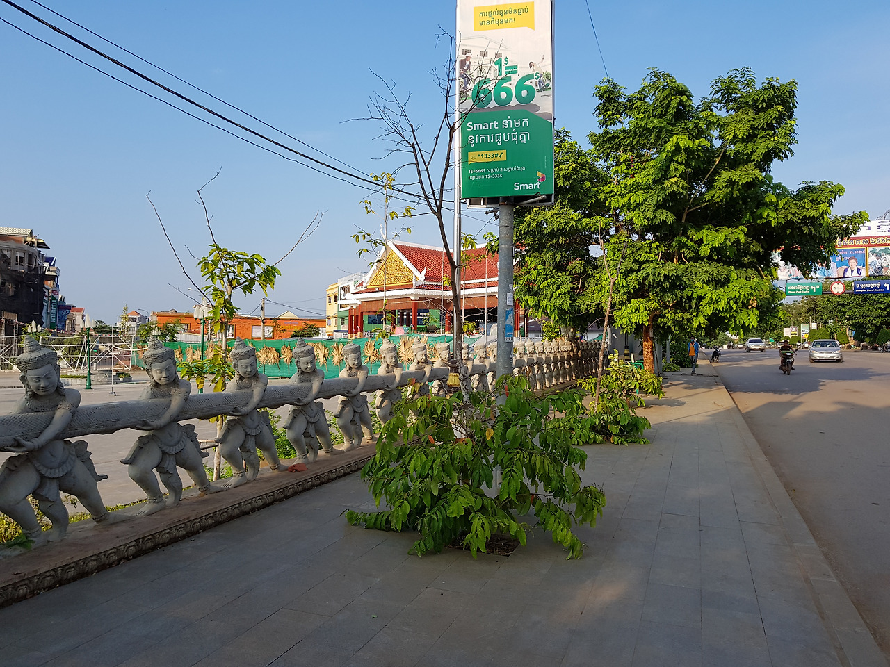 6번 국도를 달리다 보니 우측에 내가 매일 산보하던 공원이 보인다. 공원의 담이 두 세력이 줄다리기하는 씨엠립의 앙코르왓의 조각을 따와 만든 것이라 이채롭다.