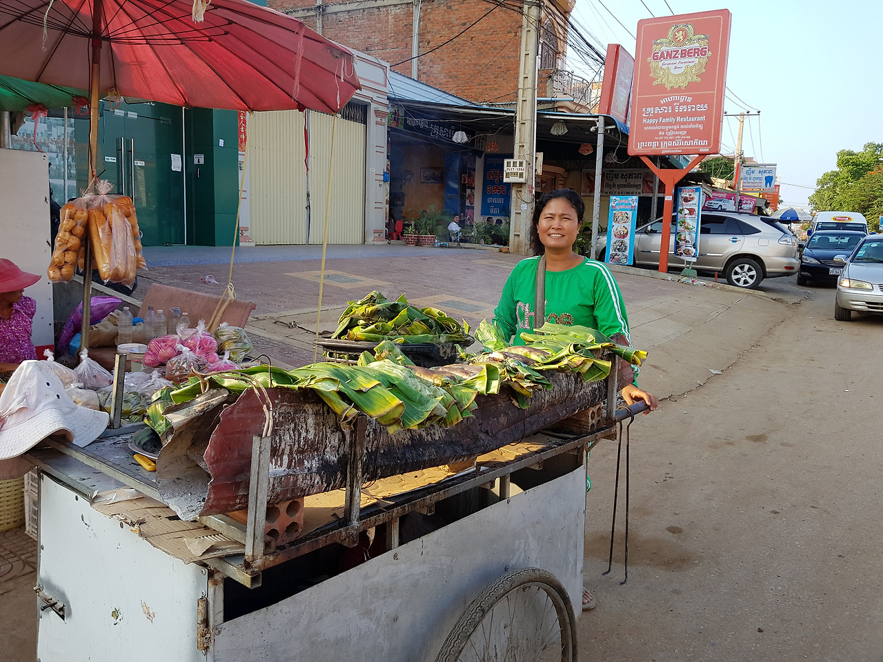 나는 길거리 식당 옆에서 쩨앙과 물을 사서 먹었다. 쩨앙은 바나나를 밥으로 싸고 그걸 바나나 잎으로 감싼 후 불에 구운 간식이다. 프놈펜에서도 먹어봤지만 달리며 간단히 먹기에는 최상의 메뉴다. 울트라마라톤 대회 때 50km 지점에 김가루로 밥을 뭉친 걸 먹었던 기억이 나는데 그것보다는 훨씬 영양분이 많은 게 틀림없다. 탄수화물 덩어리인 밥과 바나나니까.