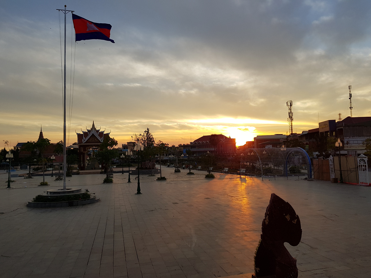 아침 6시 반의 공원은 사람이 없다. 나는 30분간 스트레칭을 하고 몇 번 뛰어본 적이 있는 반티츠마 방향의 도로를 따라 뛰려 한다. 어둠이 걷히며 솟아 오르는 태양에 캄보디아 국기가 조화를 이루고 있었다.