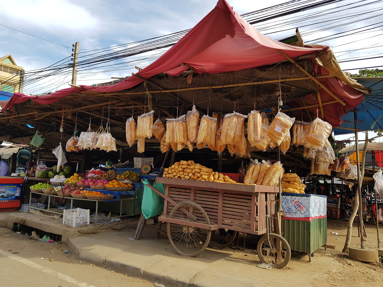 5km 지점을 28분에 통과했다. 2~3분 늦은 셈이다. 나는 재빨리 머릿속으로 셈해봤다. 10km, 15km 지점까지 지금보다 더 속도를 낼 수 있을지를 나의 몸에 물어봤다. 하지만 5km밖에 안 달린 나는 알 수가 없었다. 나는 무리하지 않고 지금의 페이스대로 달리기로 했다. 10km 지점을 앞에 두고 작은 마을 가게에 주렁주렁 달린 길거리 빵이 정겹게 느껴졌다. 이 빵을 반으로 갈라 그 안에 고기와 야채를 넣고 먹는데 "놈빵"이라고 한다. 캄보디아식 샌드위치다.