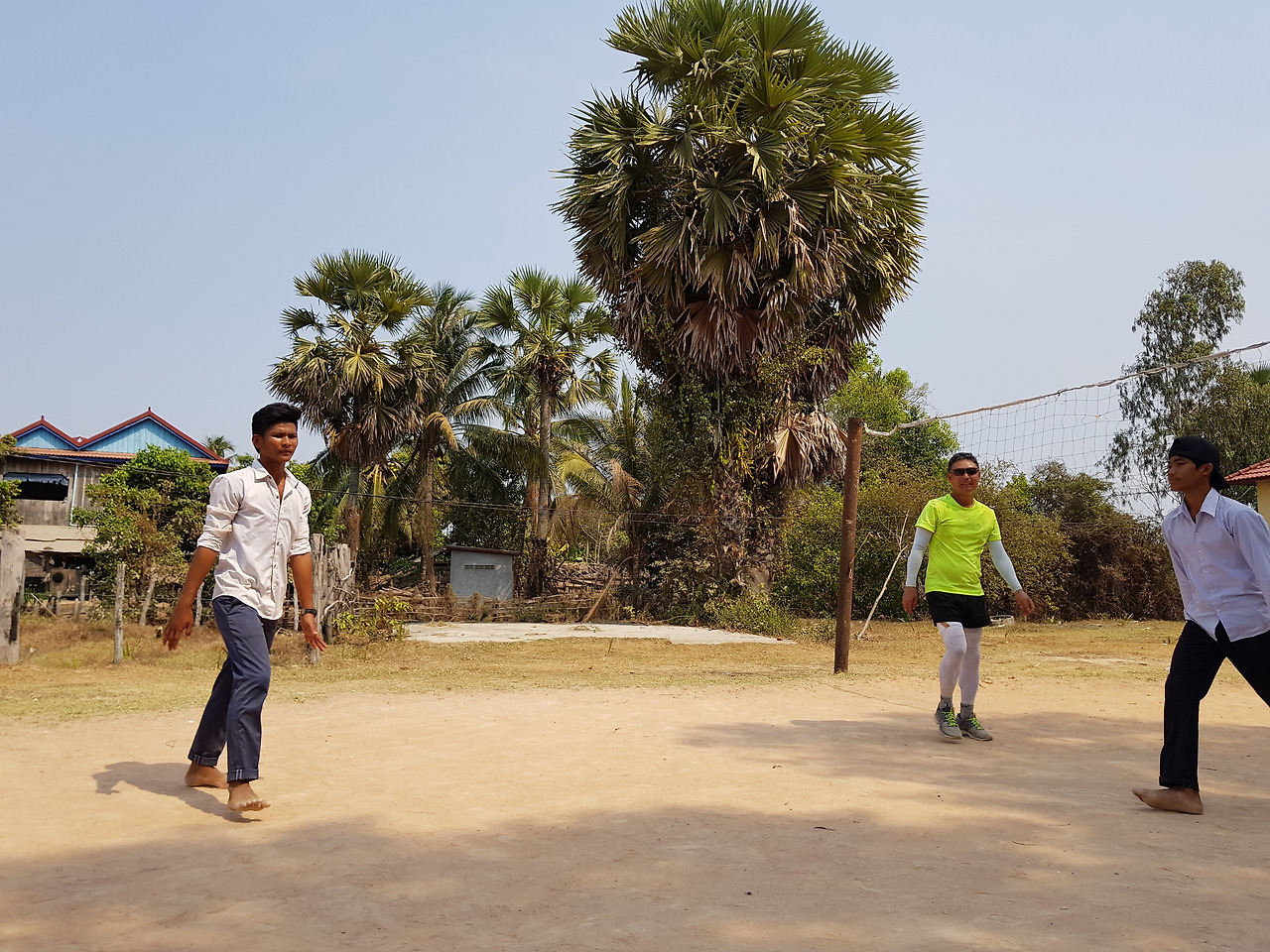 학교 안에서는 고등학생들이 긴 점심시간을 이용하여 배구를 하고 있었다. 오늘 여유가 많다 보니 나는 배낭을 내려놓고 학생들과 한참 놀았다. 배구는 캄보디아에서 축구 다음으로 인기가 있다. 동네 맨땅에 목재를 세우고 얼기설기 줄을 매단 배구코트를 심심찮게 볼 수 있다.