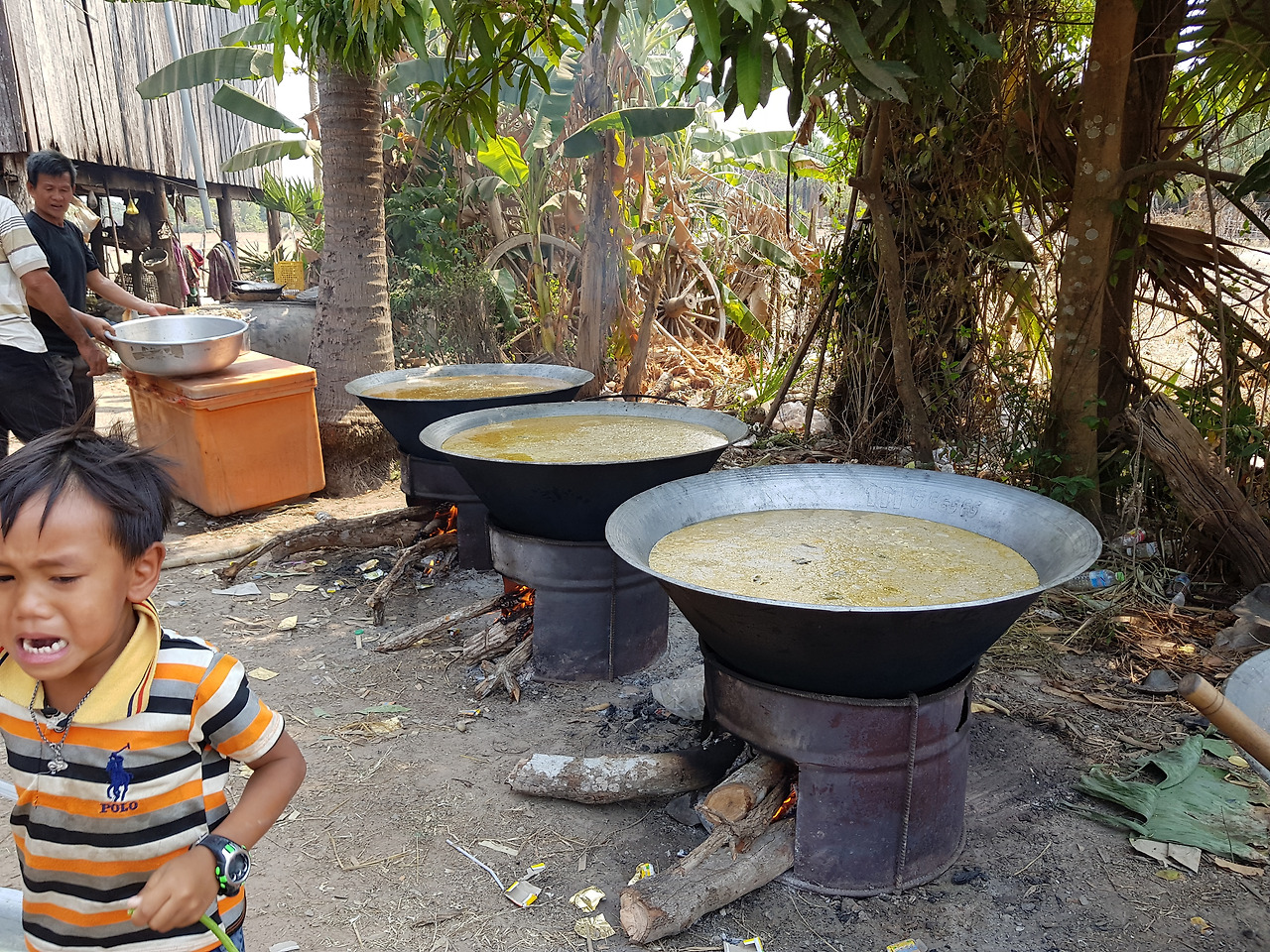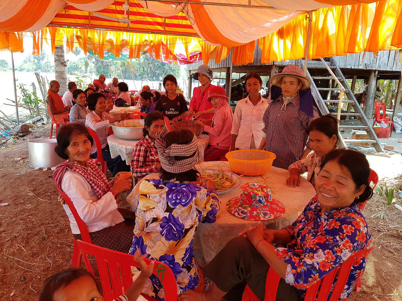 이번 도보 여행에서 결혼식 광경, 장례식 광경을 여러 번 봤다. 나는 처음으로 칠우제(우리나라는 삼우제)를 하는 마을을 만났다. 캄보디아에서는 사람이 죽은 뒤 7일 뒤 동네 사람들을 모아 제를 지내는 풍습이 있다. 우리나라의 49제는 캄보디아에서는 100일제다. 어찌 보면 죽음은 생활의 일부분이다. 칠우제에 모인 할머니들이 음식을 준비하고 한쪽에선 나이 지긋한 스님이 오늘의 제를 주관하기 위해 기다리고 있었다. 시골 마을에 나타난 이방인을 할머니들이 따뜻하게 맞아 주었다. "쭙리업쑤어"하고 내가 큰 소리로 인사하니 할머니들 모두가 합창하듯이 "쭙리업쑤어"하고 화답했다. 나는 장난기가 발동하여 다시 한번 큰소리로 인사를 건넸다. 할머니들은 이에 질세라 더 큰 목소리를 냈다. 모두가 파안대소.