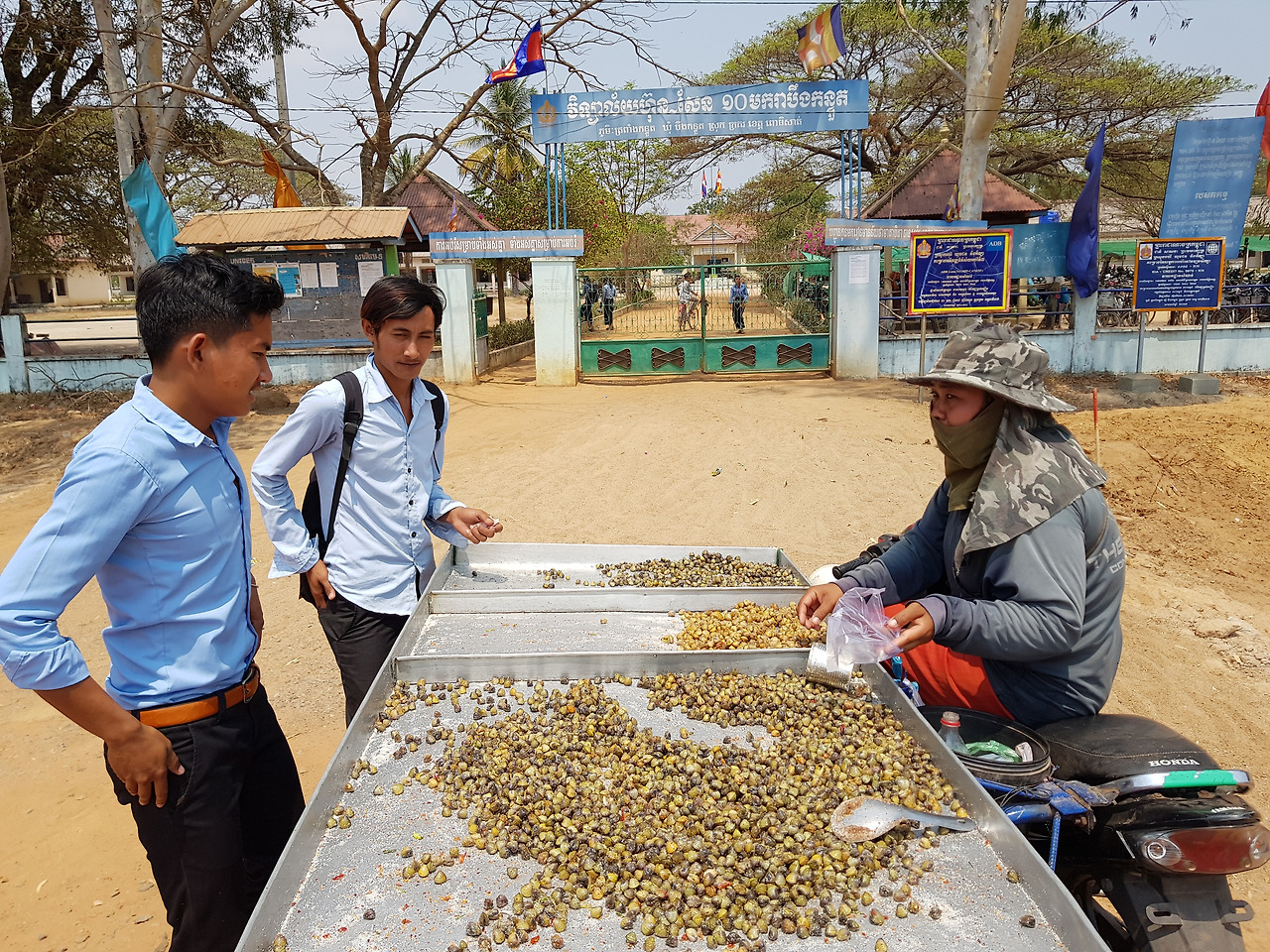 캄보디아에는 "리어할"이라는 작은 고동이 있다. 강에서 채취하여 살짝 데친 후 고추가루양념에 묻혀 파는데 시장 어딜 가나 있다. 땡볕에 그대로 놓고 파는데 우리는 그걸 먹으면 바로 배탈이 날 것 같아 먹을 엄두가 안나는 그런 종류다. 하지만 캄보디아 사람들은 잘도 먹는다. 강이나 저수지 같은 곳이 오염이 많이 되어 있고 수질도 좋지 않은데 어디서 잡은 건지 궁금하기도 했다. 리어할은 대개 아침 일찍 내오고 오전에 팔아 치운다. 아마도 야외에 오래 있으면 상하기 때문인 것 같다. 학생들도 좋아하는지 학교 앞에서 남학생들이 쪽쪽 빨며 맛을 보고 있었다.