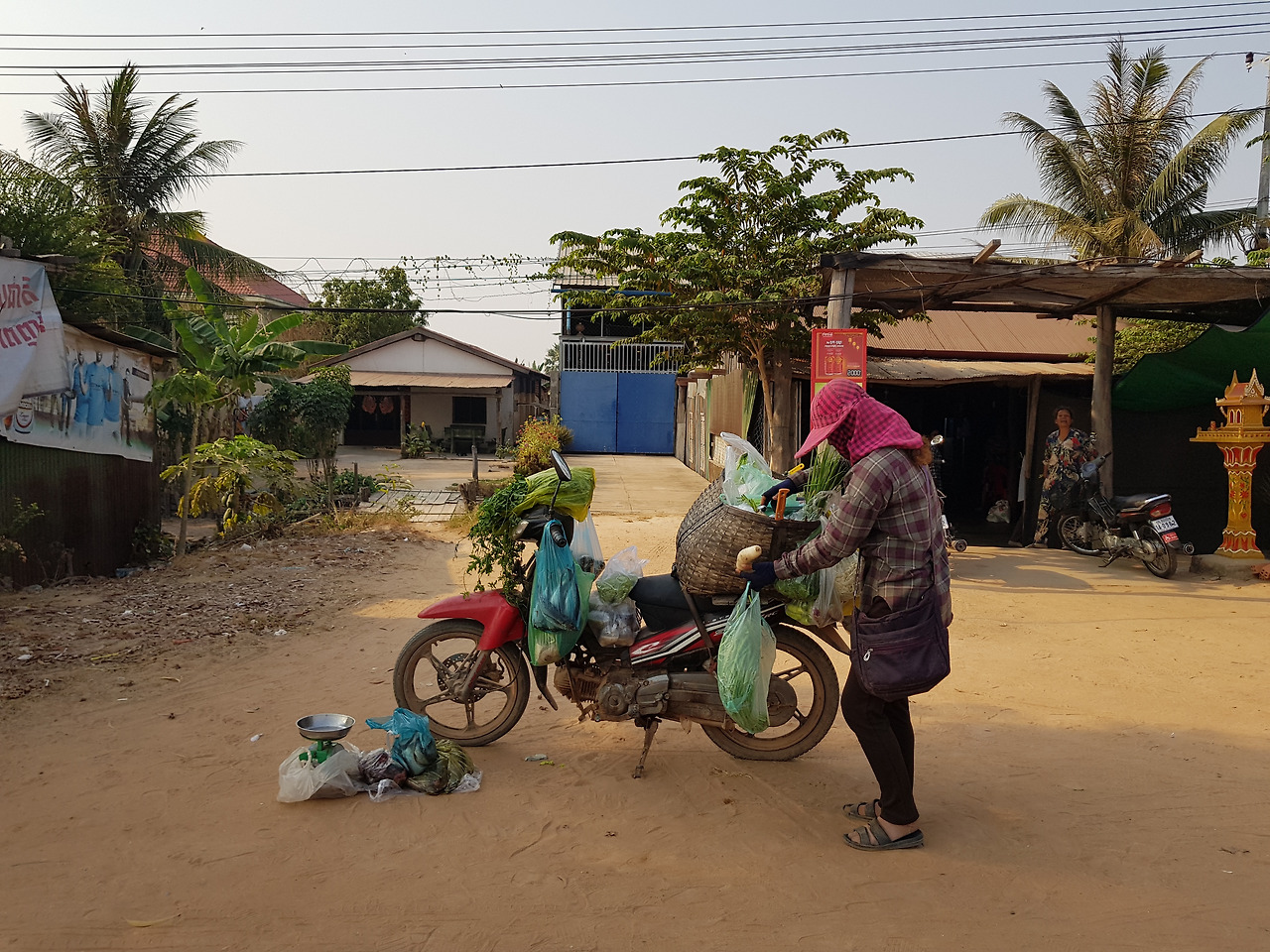 오늘은 급할 게 없다. 34km의 거리는 어제에 비하면 거의 반이다. 시내를 빠져나와 뽀삿을 상징하는 도자기 상징물을 지나니 한적한 도로가 이어졌다. 집도 거의 없고. 띄엄띄엄 있는 집들은 아침을 어떻게 준비하나 싶었는데 오토바이 야채상이 집집마다 다니면 아침을 팔고 있었다. 뭐든 저울에 달아 무게로 판다. 아침을 준비하는 게 참 소박하다. 한국에서는 냉장고에 잔뜩 재워놓고 먹는데..