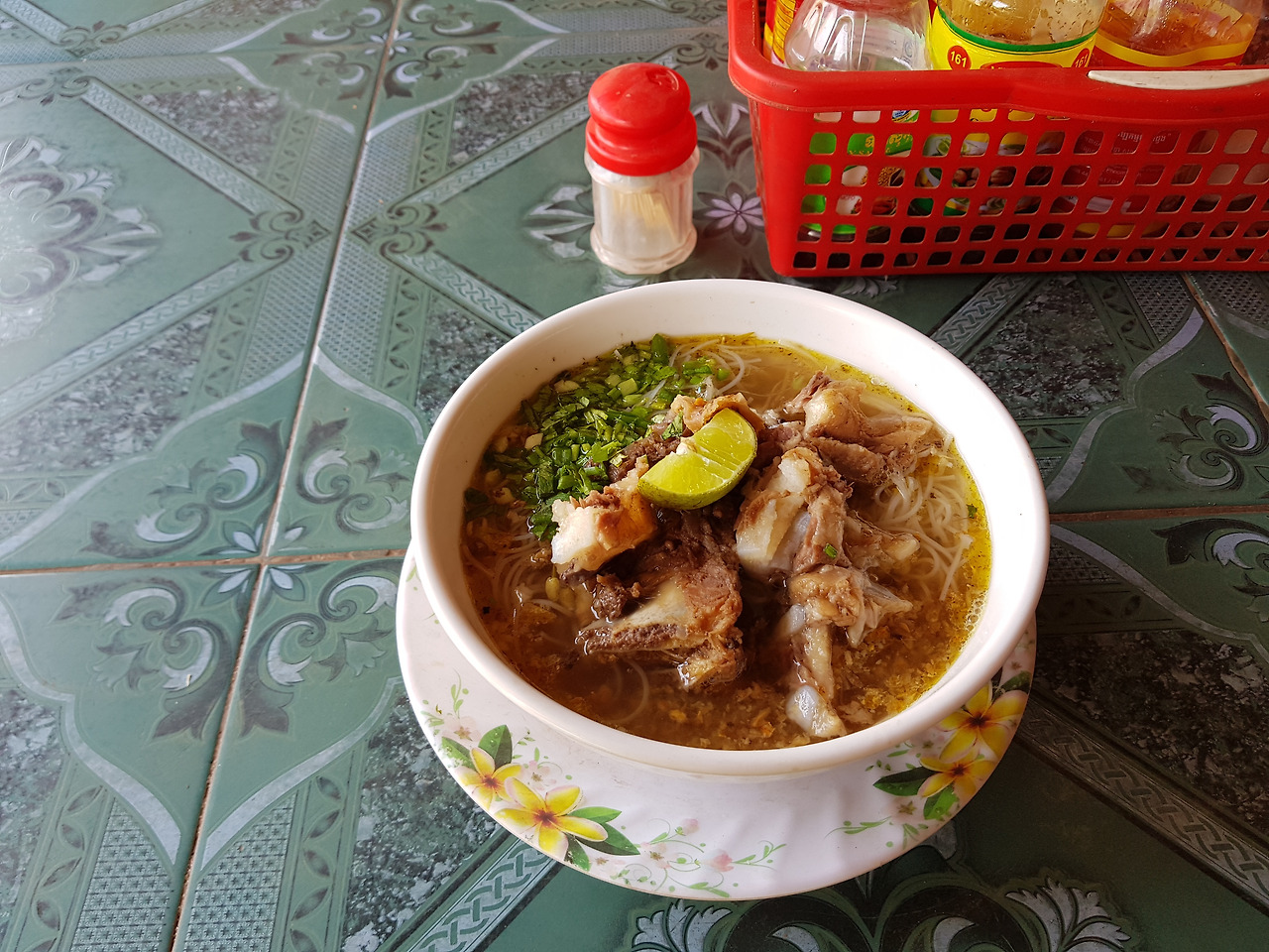 12시가 넘어 점심을 먹기 위해 가게에 들어갔다. 그다지 배가 고프지 않아 꾸이띠우(쌀국수)를 시켰다. 꾸이띠우는 캄보디아의 대표 음식인데 지역마다 조금씩 맛이 틀렸다. 이곳의 꾸이띠우는 마치 국물이 육개장 같이 걸쭉했다. 나는 깔끔한 국물을 좋하해서 건더기만 건져 먹었다. 서너 시에 도착할 목적지까지 아무것도 안 먹어도 될 정도로 배가 불렀다. 이미 20km 넘게 걸었기에 10여 km만 가면 된다. 이틀간 그렇게 많이 걷다가 오늘 여유 넘치게 걸으니 자꾸 곁눈질로 어디 들를 곳이 없나 두리번거리게 된다.