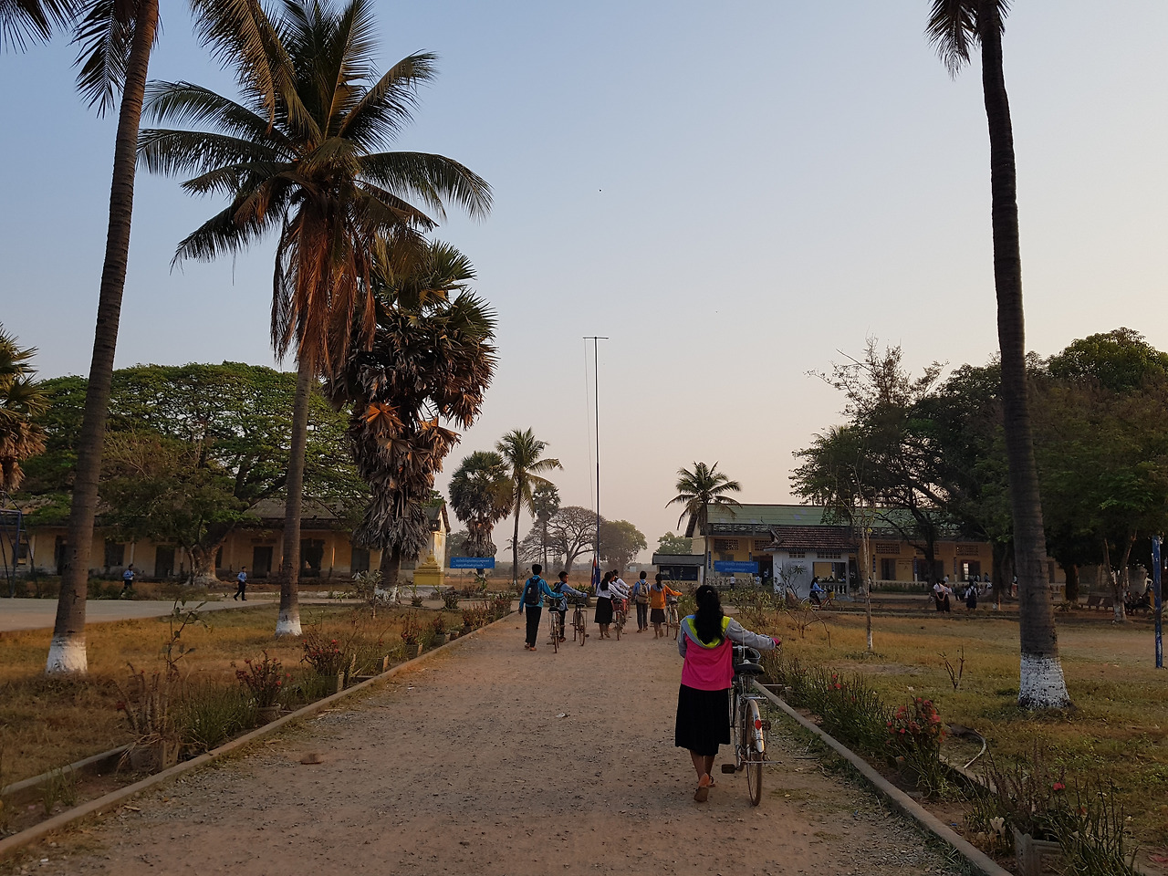 이런 소도시에는 대개 초등학교와 중학교가 하나씩 있다. 먼 곳에서 통학하는 학생들도 있기에 학생수도 많은 편이다. 캄보디아는 수업이 아침 7시 반에 시작한다. 그리고 10시 반에 오전 수업이 끝나고 오후 수업은 1시에 시작한다. 모든 학교는 매일 7시에 국기 게양식을 한다(대학교는 대개 일주일에 한 번 월요일).