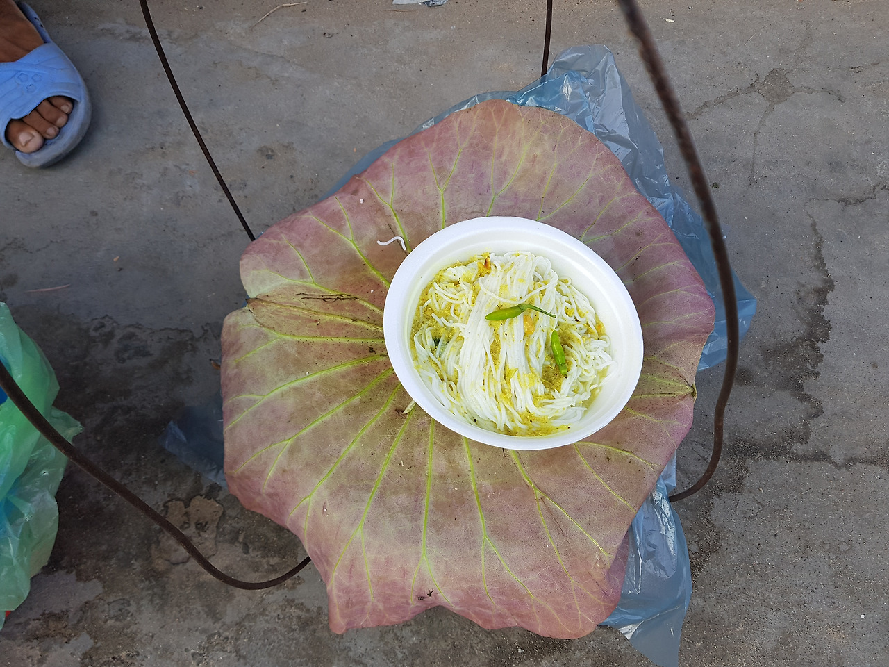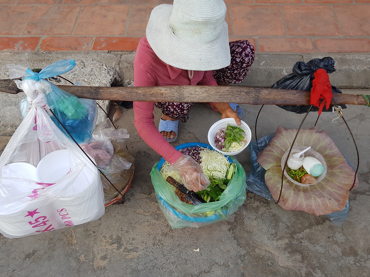 오늘은 32km. 짧은 거리다 보니 느긋하게 출발했다. 크라꺼를 빠져나가기 전 아침을 먹기로 했다. 두리번 거리며 걷고 있는데 놈반쪽 국물 항아리와 국수 야채를 어깨에 짊어지고 팔러 다니는 아주머니의 모습이 보인다. 놈반쪽은 캄보디아의 대표적 전통음식이다. 꾸이띠우(쌀국수)와 비슷하지만 국물에 독특한 향이 있어 한국 사람의 입맛에 썩 맛있지는 않다. 약간 걸죽한 국물에 삶은 국수와 다양한 야채를 가득 넣고 자작하게 해서먹는데 영양분도 풍부하여 캄보디아 사람들은 아주 좋아한다. 국물에 따라 놈반쪽썸러크마에, 놈반쪽썸러까리 두 종류가 있다. 아주머니가 파는 것은 놈반쪽썸러까리, 카레국물같이 만들어서 붙여진 이름이다. 가격은 3,000리엘(0.75달러). 길 한쪽에서 쭈그리고 앉아 먹는데 아주머니가 나의 모습을 보고 신기한 듯 계속 쳐다본다. 대개 처음 보면 할 말이 없으니 나는 어른들에게 자녀가 몇 명이냐, 결혼했냐 이런 말을 한다. 아주머니는 7명의 자녀를 두었다고 한다. 아침에는 이렇게 동네를 돌아 다니며 장사하고 오후에는 들에 나가 일한다고 했다. 고생의 끝이 안보이는 것 같지만 웃는 모습 한켠에는 희망이 있었다. 투박한 그 손이 우리네 어머니의 손이라 더욱 친근하게 느껴졌다.