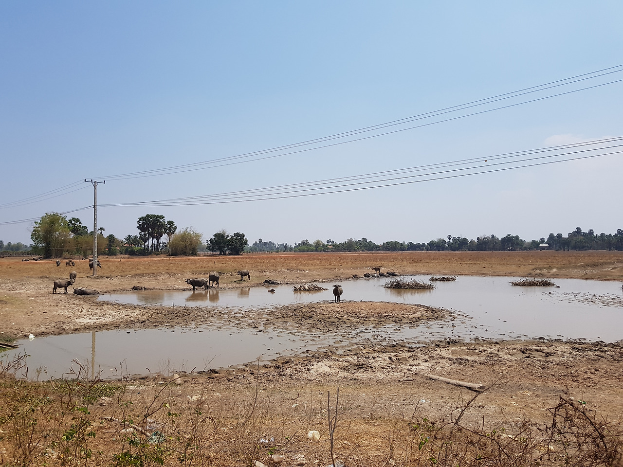 도로 옆의 들판이나 논은 도로와 턱이 없어 우기에는 이 도로가 또 잠겨서 말썽이다. 비가 많이 와도 문제, 비가 안 와도 문제, 건기와 우기가 뚜렷한 캄보디아에 우기에 엄청나게 쏟아지는 비가 일 년간 고르게 내리면 얼마나 좋을까 하는 상상을 해봤다. 이런 곳에서 만나는 작은 마을이나 학교는 시설이 보잘것없다. 캄보디아 대도시와 비교하면 딴 나라 세상이다. 초등학교 운동장 한편에 지하수를 끌어 담아 논수돗가가 있는데 가뭄으로 인해물에 이끼가 가득했다.