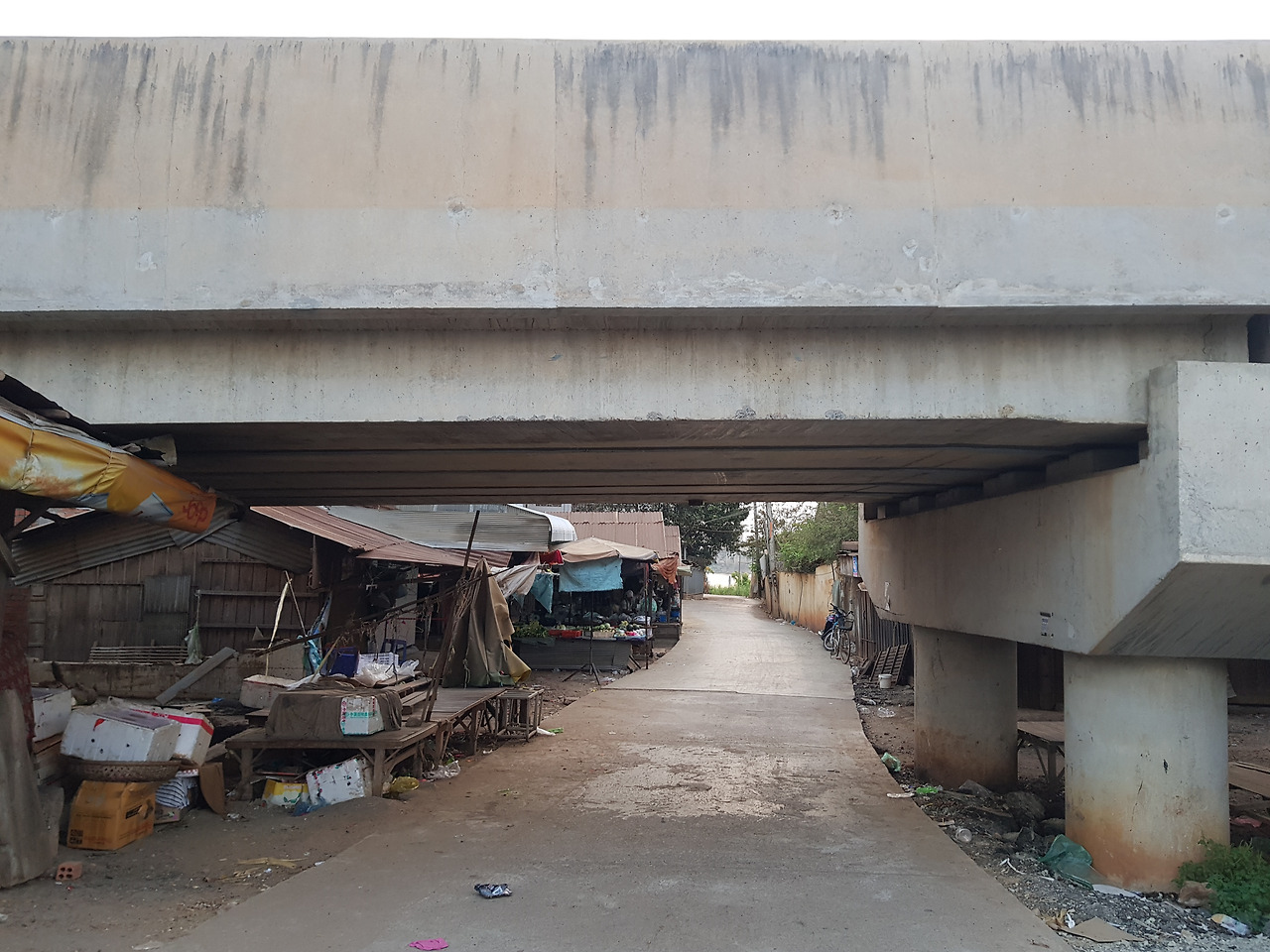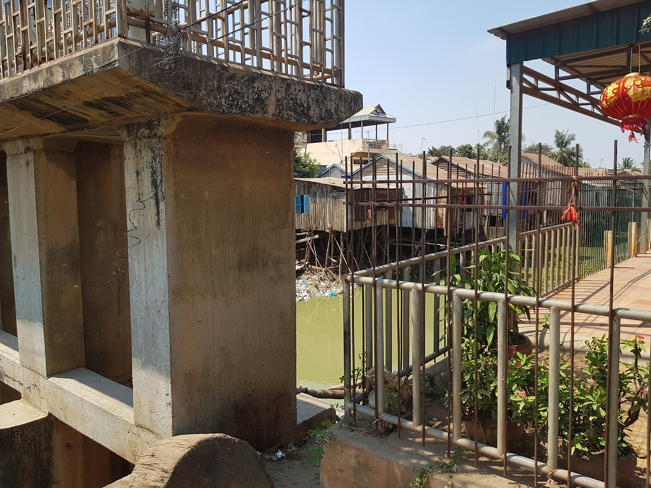 좌측이 돈레삽강이기에 좌측 갓길로 계속 걸었다. 얼마를 걸었을까 돈레삽 강을 건너 6번 국도(시엠립 방향)로 향하는 고가도로 틈 사이로 삐쭉 강물이 얼굴을 내밀었다. 나는 교각 밑을 지나 좁은 길을 뛰어서 갔다. 50여 미터밖에 안되었다