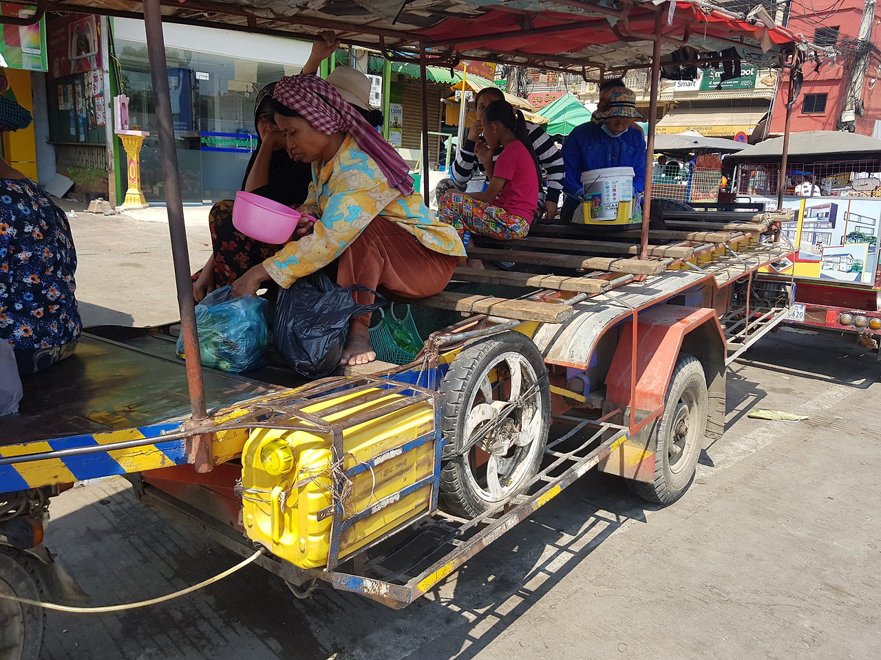캄보디아에서 프놈펜 시내를 제외하고는 시내버스가 없다 (캄보디아 시내버스도 일본의 원조로 운행되는 것이며 생긴 지 오래되진 않았다). 교통수단은 자전거, 오토바이 그리고 경운기 버스(?). 경운기 뒤를 나무판자를 대어 의자로 만들어서 시내 외곽을 다니는데 학생들 등하교나 일반인들 외출 시 길에서 서서 기다리다 손을 들면 서서 태운다. 위험하다고도 할 수 있지만 캄보디아에서는 대중교통의 역할을 톡톡이 하고 있다.