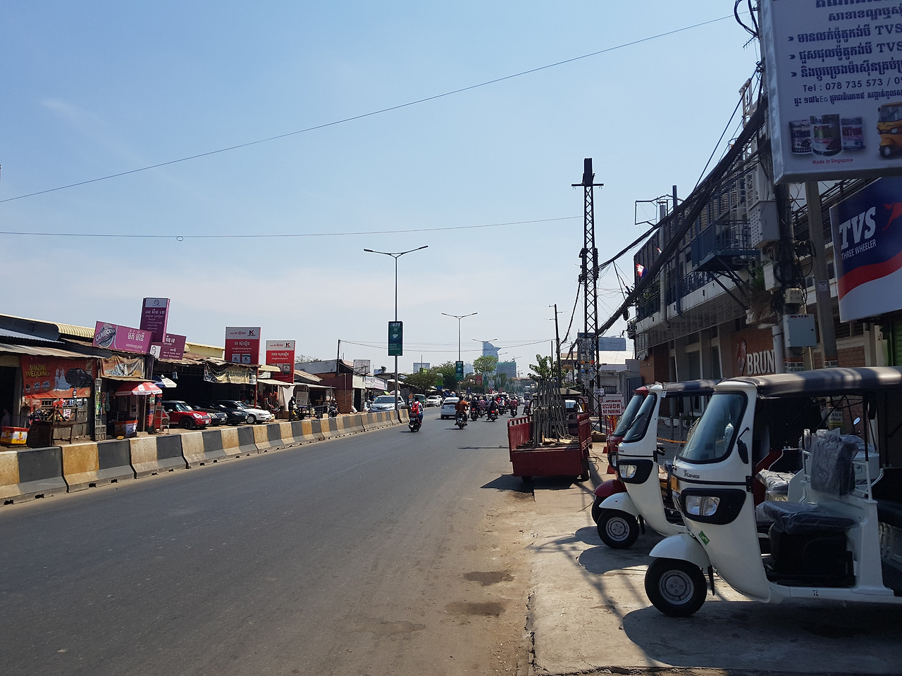프놈펜 외곽이라지만 도로가의 빽빽한 건물과 도로에 꽉 찬 차량의 매연이 한낮의 더위를 더 느끼게 한다. 사방이 막힌 이런 길을 걷을 때는 인내심이 필요하다. 보이는 광경이 사방이 막힌 답답함이 있어 눈도 매우 피곤하다. 30km 넘게 걸었으니 이제 두 시간 정도만 걸으면 된다. 아침 일찍 출발한 덕에 12시 조금 넘긴 시간이다. 배도 고프기에 쉬면서 밥 먹을 곳을 찾았다. 시원한 곳은 커피숍 밖에 없다. 도시의 커피숍은 에어컨이 있고 간단한 음식도 만든다. 나는 9일 동안 걸으며 에어컨이 있는 커피숍에 딱 한번 들어갔었다(깜퐁츠낭시의 커피숍). 길거리 식당에는 에어컨 있는 곳은 없다. 냉장고도 없고 대부분이 아이스박스다. 시원하게 쉴 공간이 없으니 잠깐 그늘에 있다가 다시 걷게 된다. 한국과 같이 에어컨이 있는 커피숍이 곳곳에 있다면 아마도 쉬고 싶은 유혹에 걷는 계획도 차질이 있었을 것이다. 캄보디아의 이런 환경은 나를 쉬지 않게 걷게 만들었으니 한편으로는 고맙기도 하다.