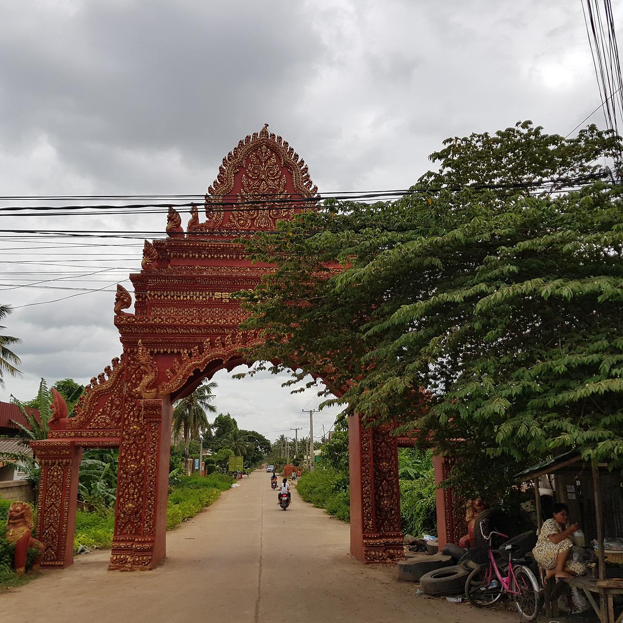 시내와 가까워지니 사원의 문이 시골의 작은 사원과 다르게 화려하다. 달리면서 무척 많은 사원 문을 만났다. 사원은 대개 길 안쪽에 있어 보이지 않는다. 다만 길가의 사원 문(캄보디아 말로 '고뿌라'라고 한다)의 규모를 보면 사원의 크기를 짐작할 수 있다. 갈수록 크기만 강조하는 캄보디아 불교 사원이 한국 대형교회의 모습과 별반 차이가 없는 것 같아 씁쓸하기도 하다.