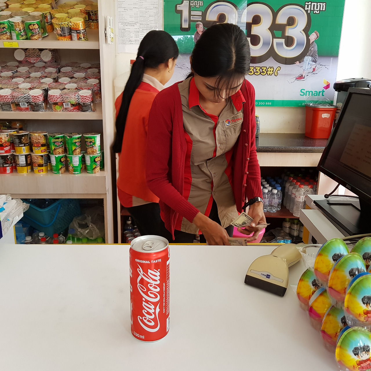 세레이소폰 시내는 반티민쩨이주의 주도다. 내가 살고 있는 곳이기도 하고. 요즘 이곳에도 에어컨이 있는 좋은 시설의 커피숍이 들어서고 있다. 31km를 달린 내 피부는 땀이 소금이 되어 하얗게 변했다. 얼른 샤워를 하고 시원한 커피숍에서 아이스 모카커피를 마시고 싶다. 하지만 나는 시내 종착점에 도착하면 매번 주유소에 딸린 시원한 이곳 편의점에서 포카리스웨트를 마시며 잠깐의 휴식을 취하곤 한다. 이온음료는 다른 데는 잘 팔지 않는다. 오늘 달리며 500L 물을 여섯 개 마셨다. 속이 아직도 출렁거리는 것 같다. 이온음료 대신 콜라를 골랐다. 그래도 콜라는 톡 쏘는 맛에 목 넘김이 좋다.