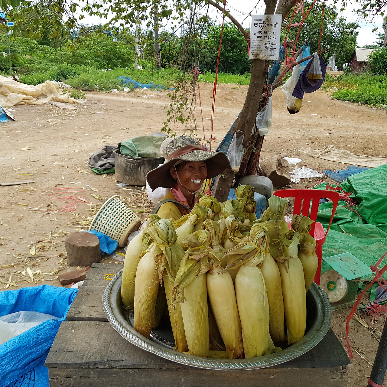 캄보디아 전통 수건 '끄러마'를 두른 농부 아주머니