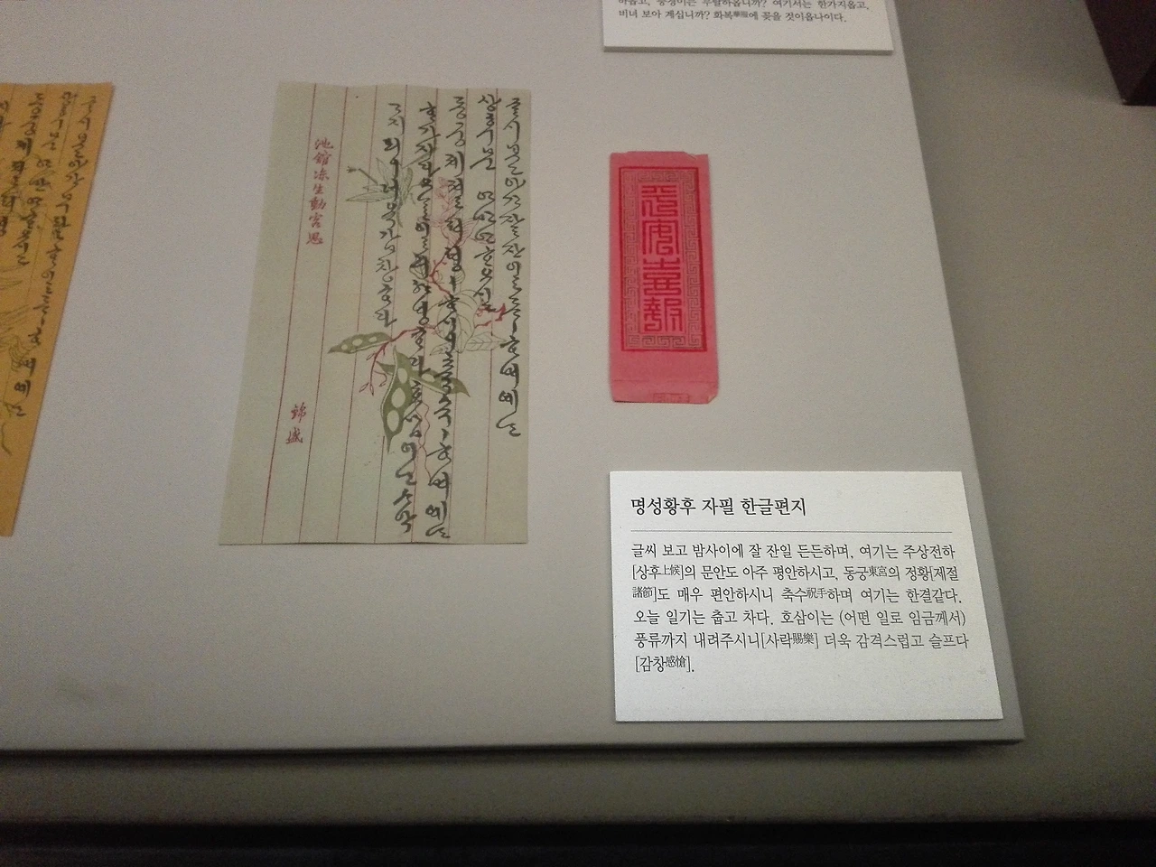 사진을 좀 더 잘 찍었으면 좋았겠지만..ㅜㅜ 전시물 설명대로 유려한 흘림 궁체가 참으로 인상적이다. 친정에 보낸 것으로 보이는 편지의 내용도 가슴을 저미게 한다.
