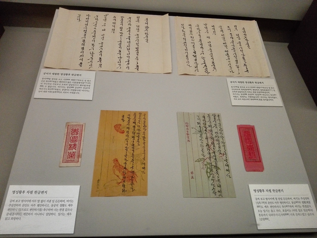 이 편지들 중 위쪽 두 편은 명성황후가 궁녀들로 하여금 대필하게 한 것이고, 아래 두 편은 명성황후의 친필이라고 한다.