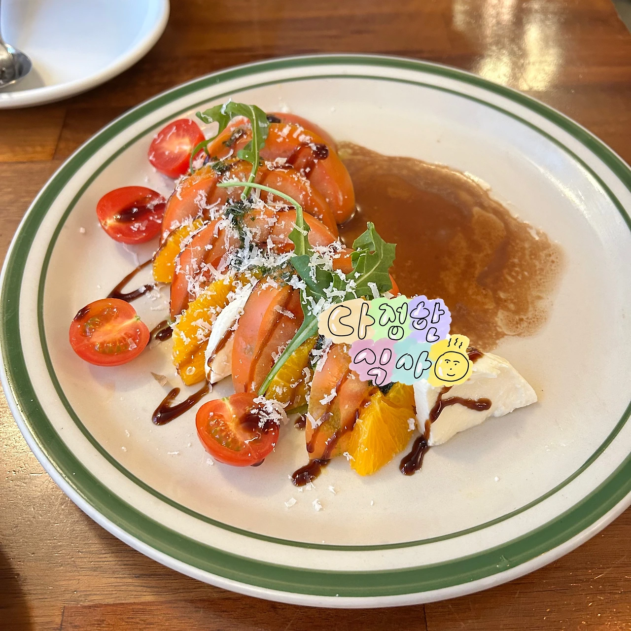 식사 전, 샐러드를 먹는다. 혈당 그런 거 때문이 아니다. 배고파 죽겠는데 저것만 나와서다. 토마토, 치즈, 귤의 조화가 훌륭하다. 뒤이어 나온 스테이크. 미디엄으로 구웠지만 약간 질기다. 위에 얹은 양파, 고추 장아찌 같은 양념이 맛있다.