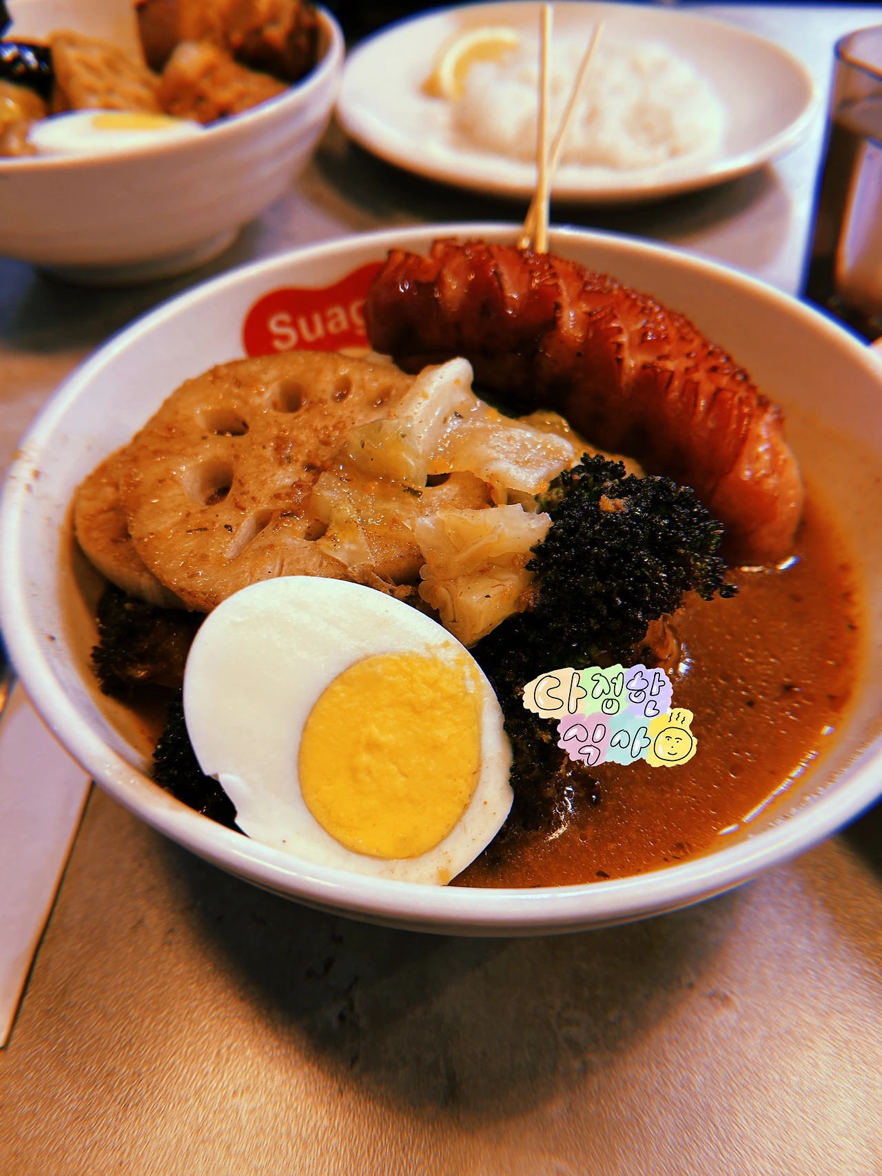 수프카레. 말 그대로 국처럼 국물을 떠먹는 카레이다. 일반 카레처럼 카레가 진득하지 않고 물처럼 후루룩 떨어진다. 그 국물은 카레맛이지만 뭔가 먹기에 가벼워 자꾸 퍼먹게 된다.