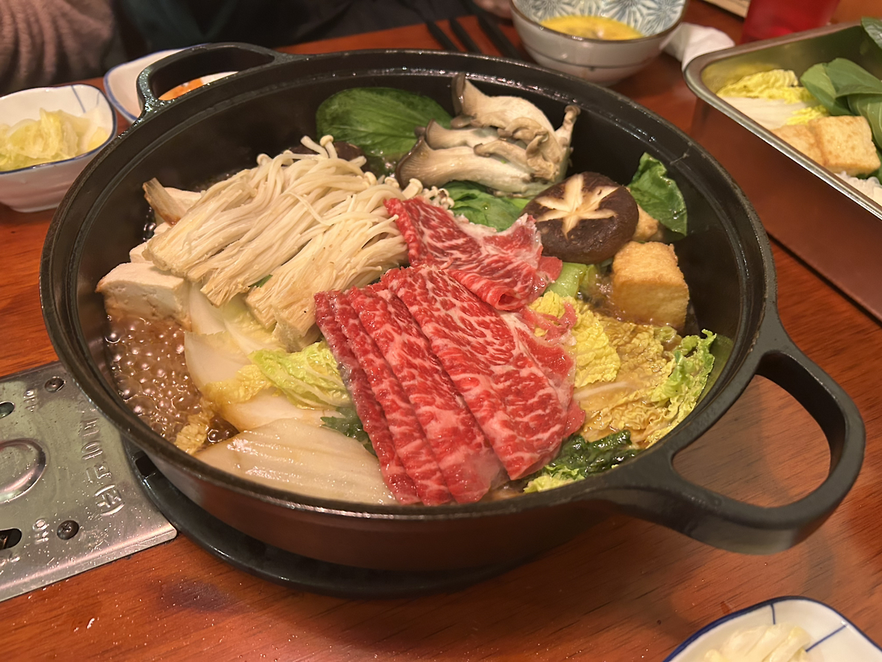2025년 첫 출근일 저녁은 스키야키. 처음 먹어본 스키야키 맛은 대단히 짰다. 새로운 시도, 새로운 한 해의 시작.