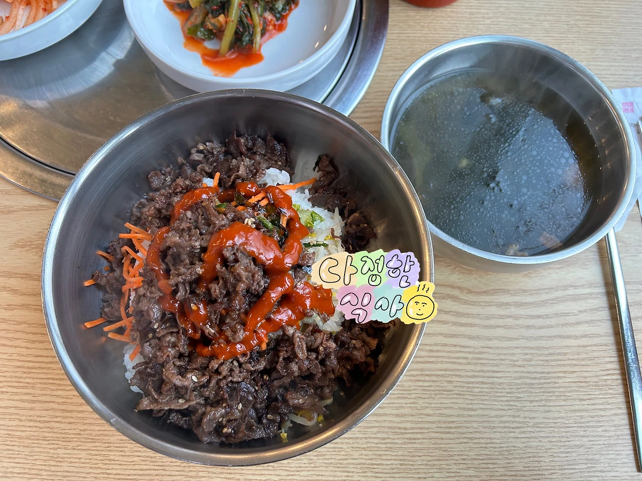 불고기 비빔밥을 또 먹었다. 잘게 잘린 불고기 속 숙주나물과 밥, 당근까지. 모든 게 완벽하다. 탄단지가 완벽한 음식이야. 숙주랑 가득 밥을 퍼서 먹으면 입안 가득 아삭아삭! 고기와 같이 먹으면 바싹 구워진 고기가 피자토핑 같다.