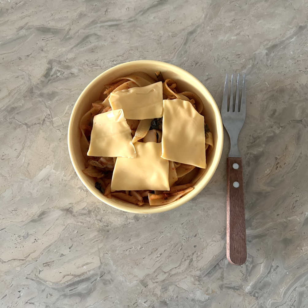 포털 사이트에서 본 ‘라면수프 김치 파스타’. 다 먹고 생각해 보니 ‘오, 맛있어’가 아니라, ‘? 김치맛.’ 정도의 맛. 버터를 넣지 않아 그럴지도.