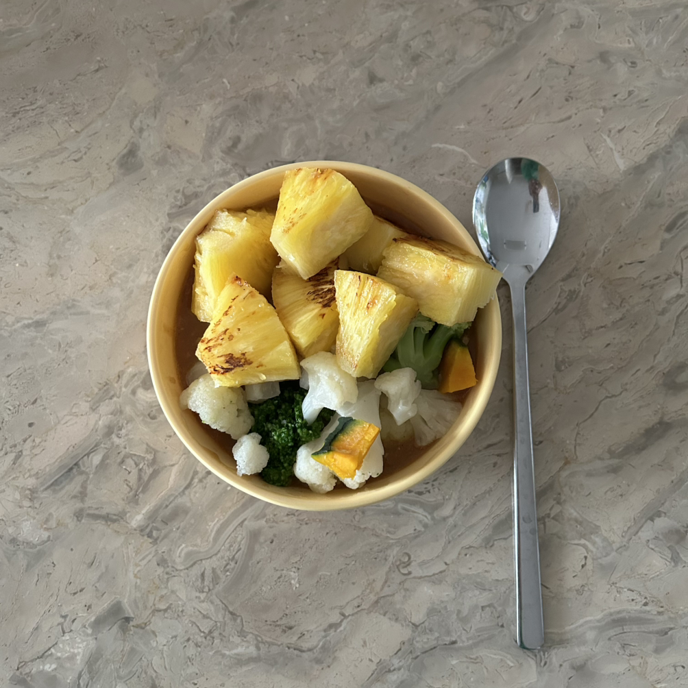 목표는 수프카레(スプカレ)였으나, 그냥 국물 많은 카레가 됐다.(그게 수프카레 일수도…) 토마토와 마늘, 닭가슴살을 넣고 끓인 카레에 믹스 야채를 쪄 넣고, 파인애플을 구워 올렸다.