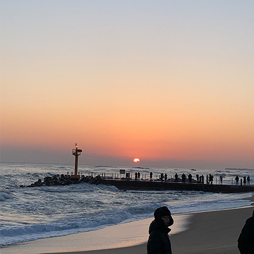 다음날 아침 꼭 일출을 봐야 한다고 잔소리하는 친구 옆에서 심드렁하게 잠을 잤다. 아침 7시 20분에 일어나 침대에 앉아있자니 날도 춥고 만사가 귀찮았다. '가지 말아야겠다' 생각하고 다시 누우려다 창밖을 봤는데 검정 패딩을 입은 무리가 횡단보도를 향해 뛰어오는 것이 보였다. 숙소에서 바다까지는 3분. 저 사람들은 먼 곳에서도 일출을 보러 뛰어오는데.. 나는 뭔가? 갑자기 내 자신이 너무 한심해 보여서 대충 겉옷만 입고 일출을 보러 나갔다.