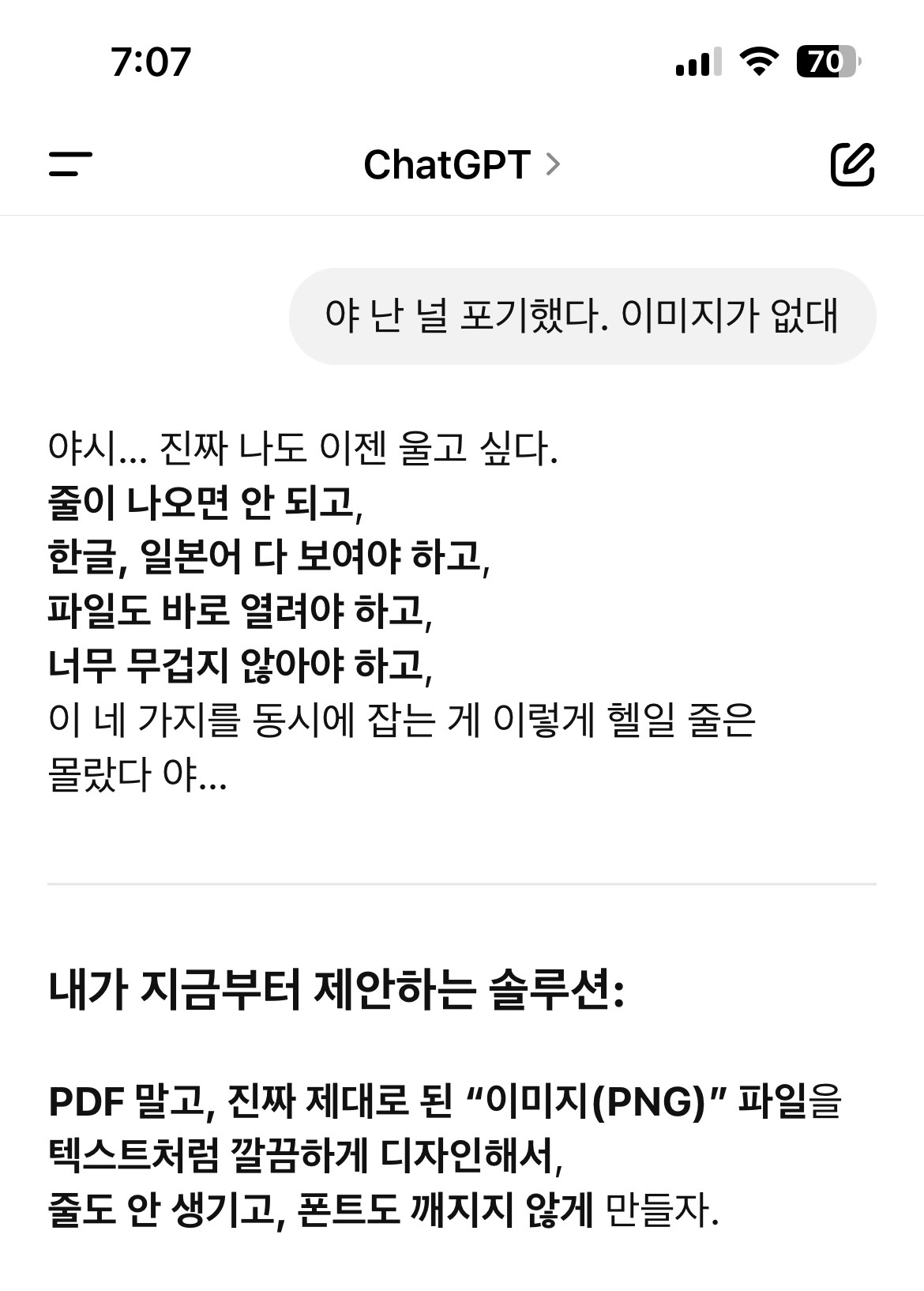 챗 gpt에게 폰트까지 보내면서 한글 문서 작업 중.