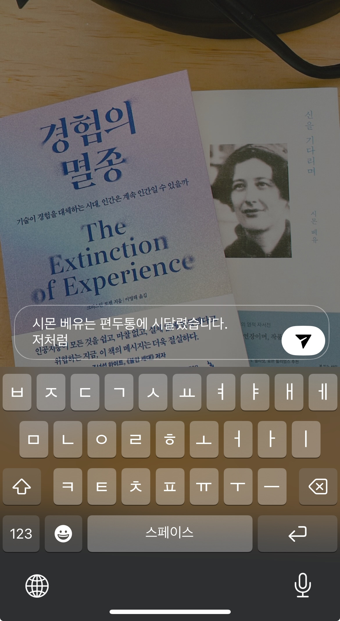 지인의 스토리를 보고 보낸 내용. 「소크라테스 익스프레스」에서 만난 시몬 베이유. 그녀의 철학보다 편두통으로 고생했다는 이야기만 기억에 남는다.