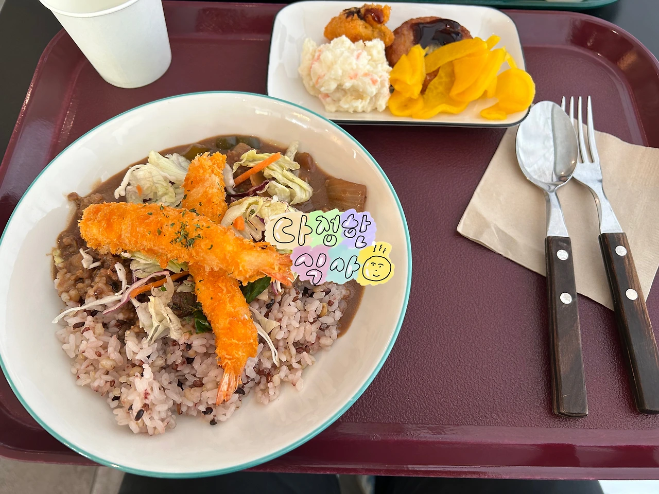 소고기 하이라이스에 새우튀김. 그리고 자율배식으로 먹을 수 있는 해물전. 새우튀김은 약간 눅눅했다. 좀 불은 거 같다. 그래도 꼬리까지 싹 다 해치웠다.