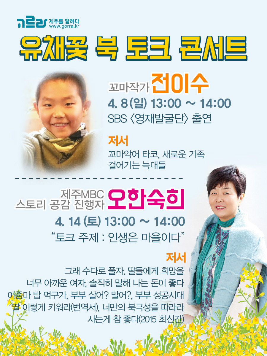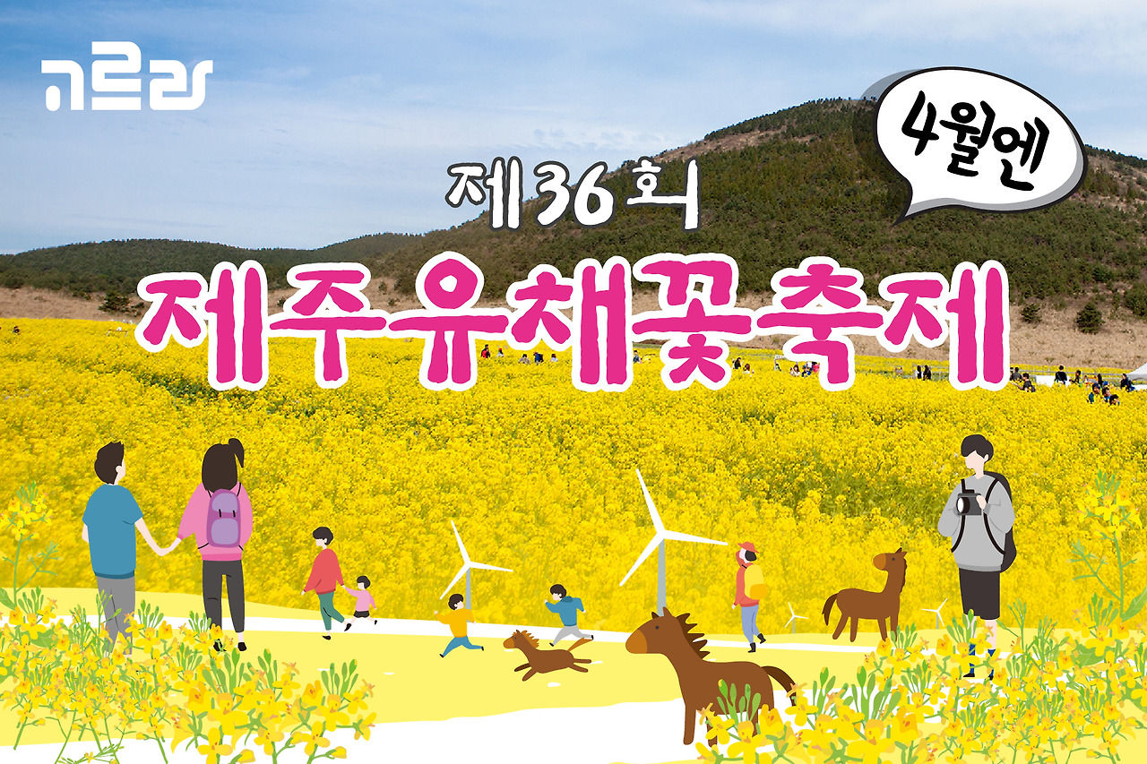 < 제주 유채꽃축제 '오늘도 꽃길만 가시리' >- 행사기간 : 2018.04.07(토) - 04.15(일)- 행사장소 : 서귀포시 표선면 가시리 산41 (조랑말체험공원) - 홈페이지 : http://www.jejuflowerfestival.com- 문의 : 064-787-7012