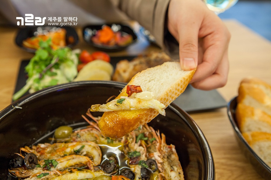 먹기 좋게 손질된 딱새우가 가득 들어간 딱새우 감바스는 바삭한 바게트 빵에 찍어 먹으면, 딱새우의 깊고 진한 풍미를 가득 느낄 수 있는데요~