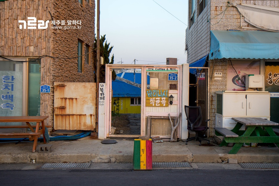 제주 여행 중 혼자만의 시간을 보내고 싶을 때, 찾아가면 좋은 카페 바라나시 책골목. 이곳은 제주시의 바다가 보이는 횟집들 사이에 자리 잡은 아주 작은 북카페랍니다. 이런 곳에 카페가 있었나? 싶을 정도로 구석진 곳에 위치해 있는데요.