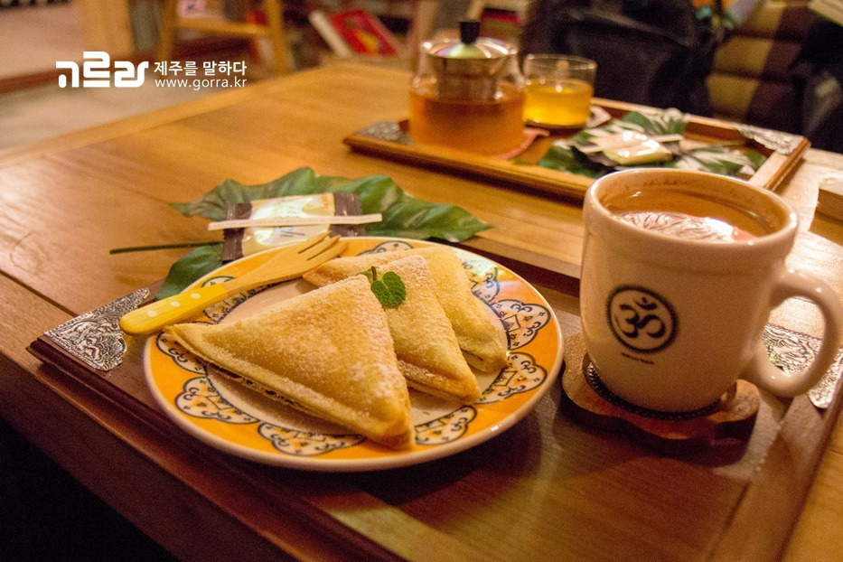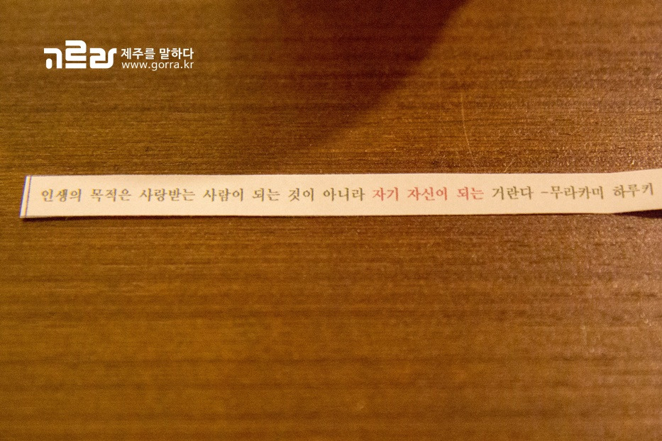 마실 것은 핸드드립(인디아몬순AA) 커피, 짜이, 제주 레몬 아쌈 홍차가 있으며, 간단한 토스트가 함께 마련되어 있답니다. 음료를 주문하면 작은 스낵과 그날그날 주인장이 뽑은 짧은 문구를 함께 내어주는데요.