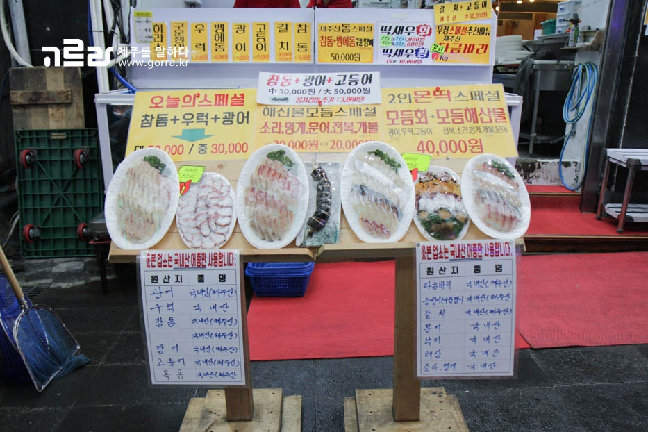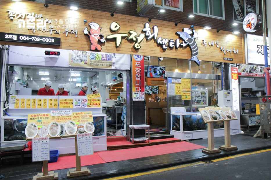서귀포 매일올레시장 안쪽에 위치해 있는 우정회센타 2호점은 국내산 활어회를 취급하는 횟집이랍니다. 이중에서도 가게 앞쪽에 소개되고 있는 모듬회와 딱새우회, 꽁치김밥이 가장 인기 메뉴!