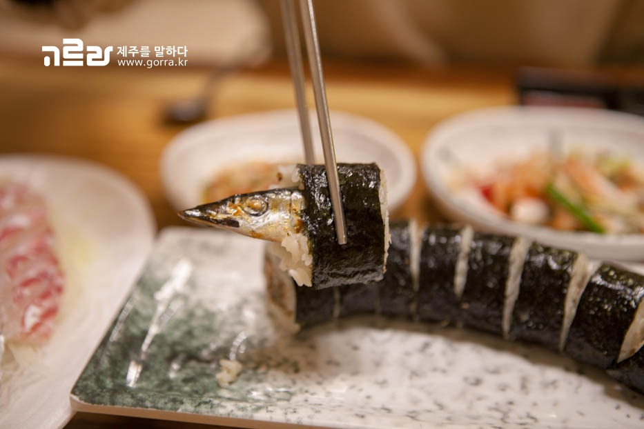 딱새우와 함께 즐길 수 있는 꽁치김밥은 3,000원! 꽁치김밥은 따뜻할 때 먹으면 가장 맛있으니 회 한 점 쌈 사 먹은 뒤, 고소한 꽁치와 밥의 조화를 느껴보세요~!
