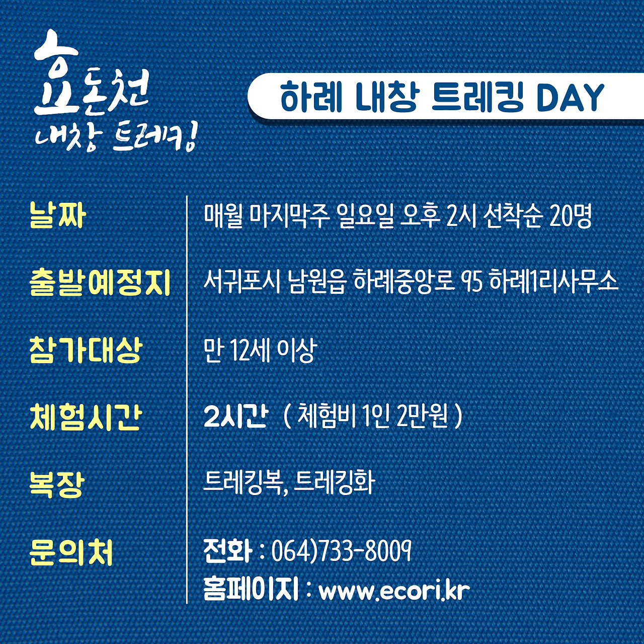 이곳에서 자연 그대로의 효돈천과 함께 주민과 전문가가 정밀한 모니터링을 통해 개발한 트레킹 코스를 경험해보세요! 전문 트래킹 해설사 교육을 받은 생태해설가와 함께하니 효돈천에 대한 많은 이야기를 들으며 안전하게 즐길 수 있겠죠?