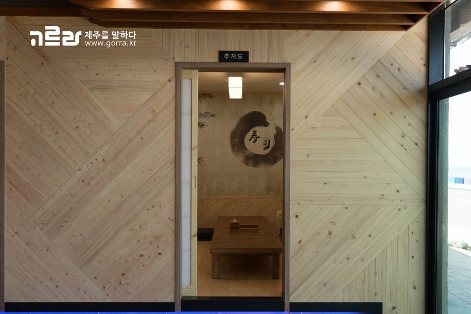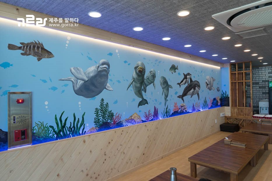 내부에는 바닷속 내부를 여행하는 듯한 돌고래 무리가 벽 한 면을 가득 채우고 있답니다. 좌식 테이블, 일반 테이블, 룸 형식으로 분리되어 있는 이곳은 각기 다른 테이블 구조만큼 간단한 식사부터 단체 모임까지 가능합니다.