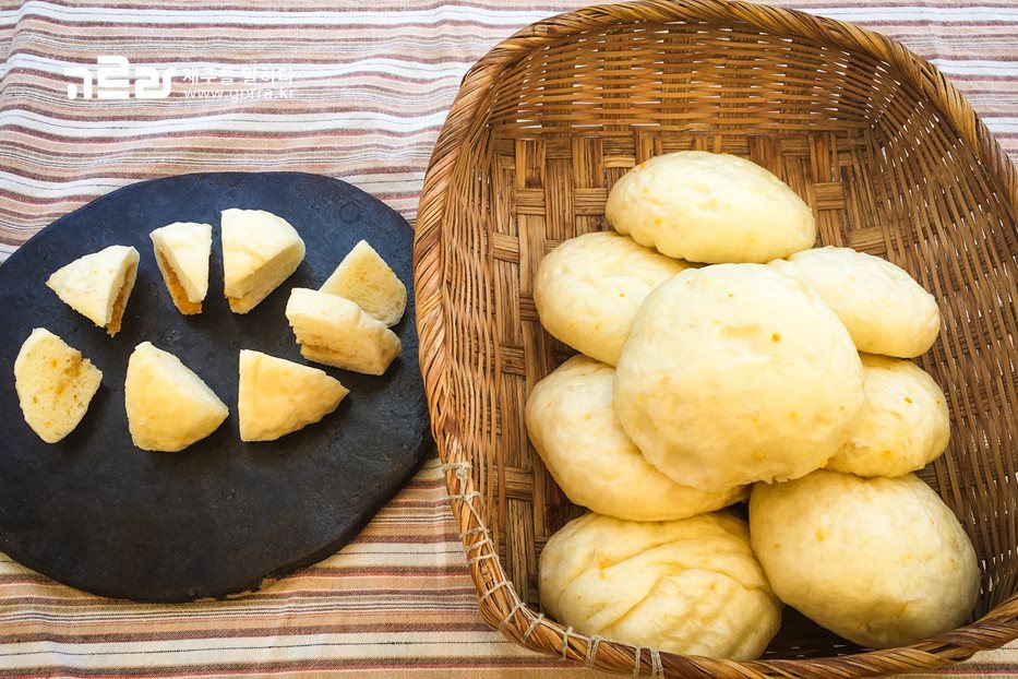 제주도 전통빵인 상웨빵에 감귤과피를 넣어 만드는 빵이랍니다. 상웨빵은 떡의 대용으로 밀가루에 막걸리로 발효시켜 만드는데요~ 식감이 아주 쫀득한 특징을 지녀요. 그 반죽에 감귤과피가 들어가고, 감귤이 들어간 달콤한 소가 들어있답니다.