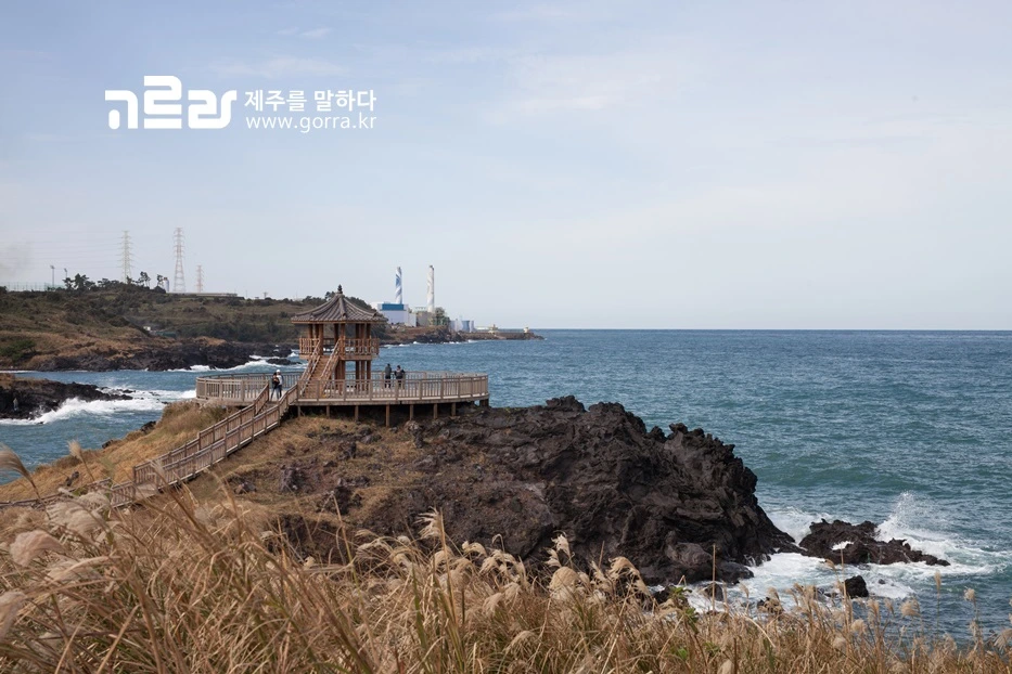 양 옆에 펼쳐진 억새를 보며 나무길을 걷다 보면 나타나는 팔각정. 이 곳에 앉으면 뒤로 펼쳐진 한라산과 앞으로 보이는 바다를 함께 만나실 수 있습니다. 억새와 바다를 한 번에 볼 수 있는 드라이브 코스로 딱이죠?