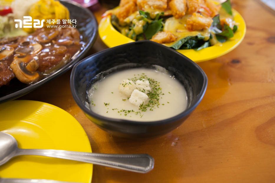 그렇기에 스프 위에 올려진 크루통도 다른 곳과는 다르게 딱딱하지 않고 부드러워 어린 아이들에게도 안성맞춤입니다. 부드럽고 고소한 맛의 기본 스프는 돈까스를 먹기 전 속을 채우기에 딱!